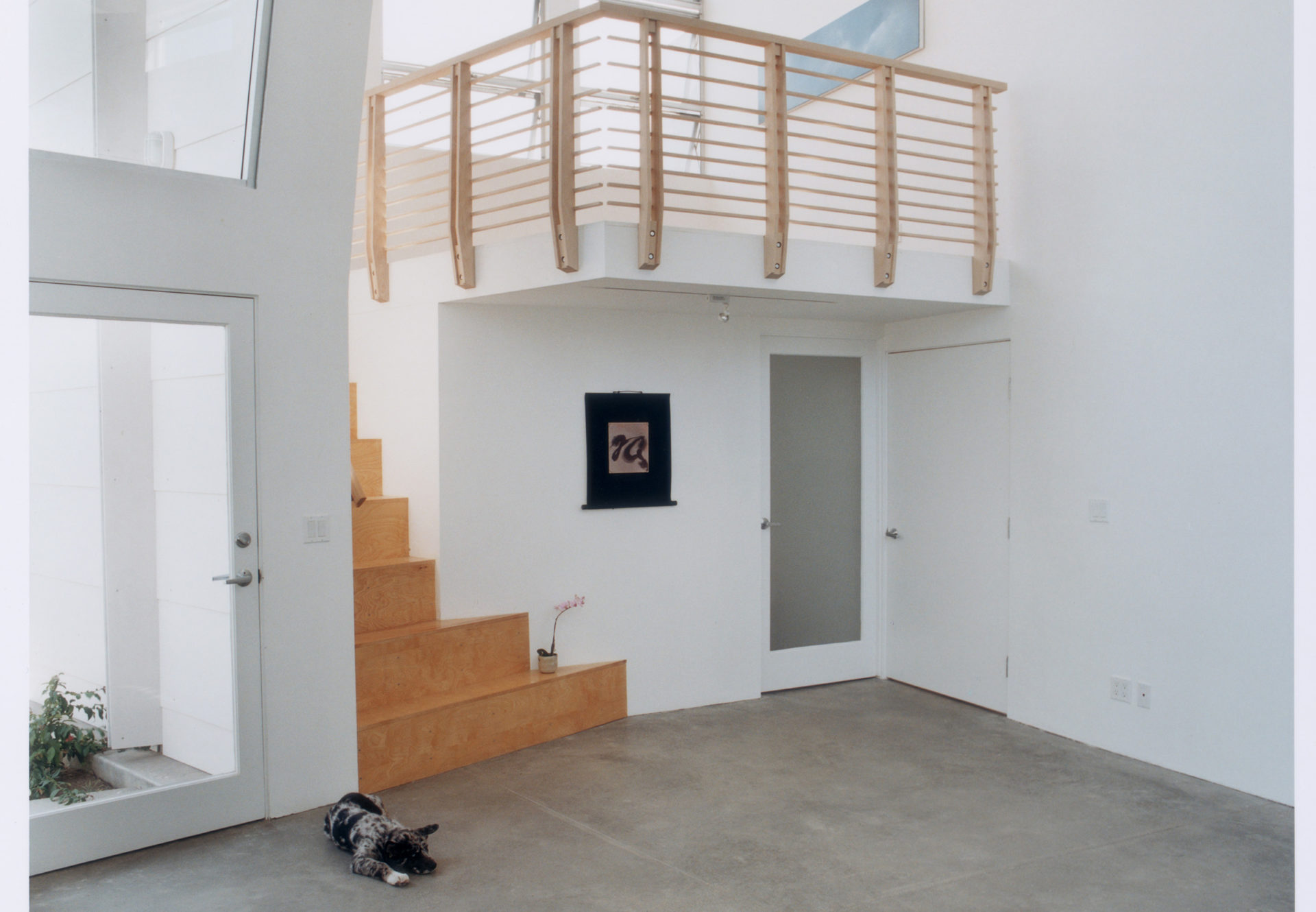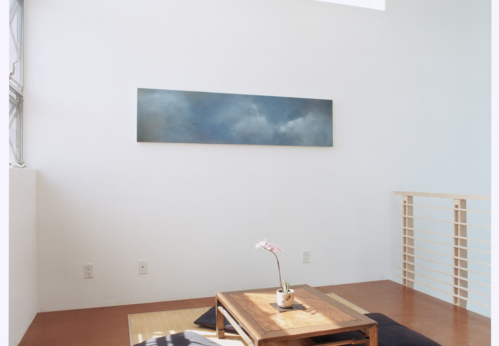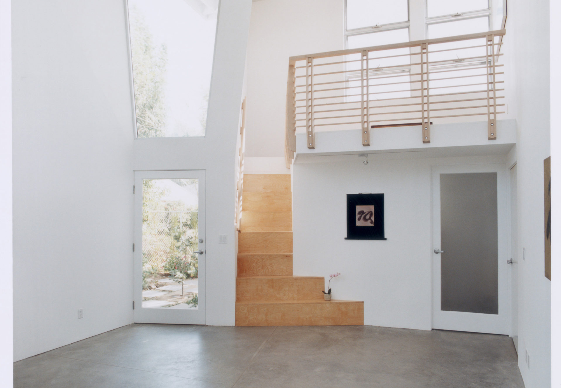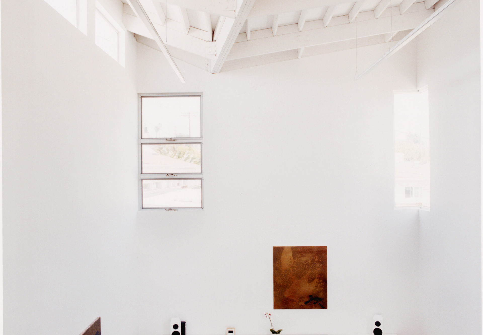 This 1,200 square foot studio for a painter based in West Los Angeles provides additional workspace illuminated by filtered, soft light. The artist, whose works require long drying periods under indirect sunlight, wanted to have a tall, light-filled space to finish and display his paintings. It was important that the new studio not only share the basic display functionality of an art gallery, but also to be able to recreate the light characteristics of where his work would eventually hang.