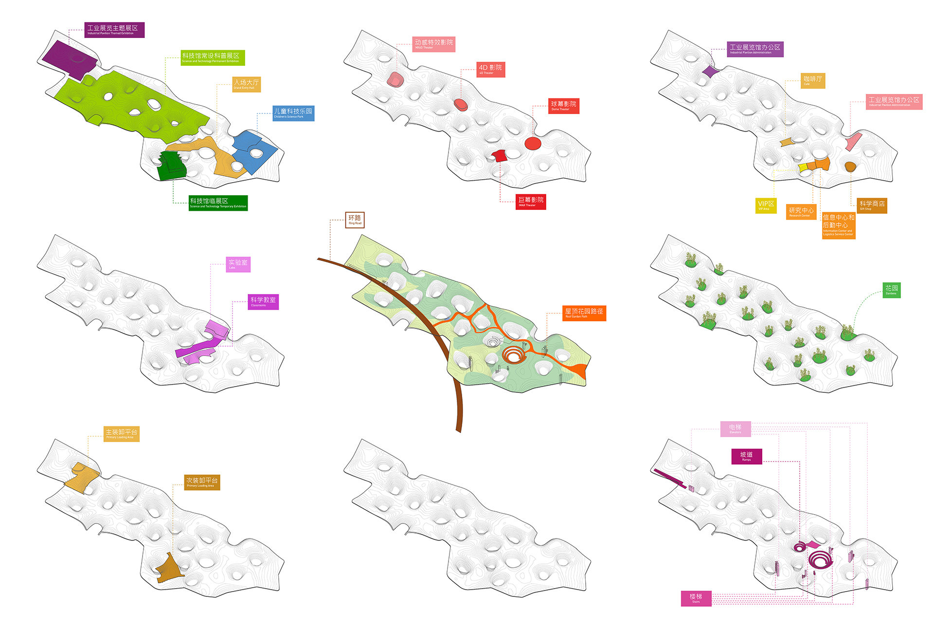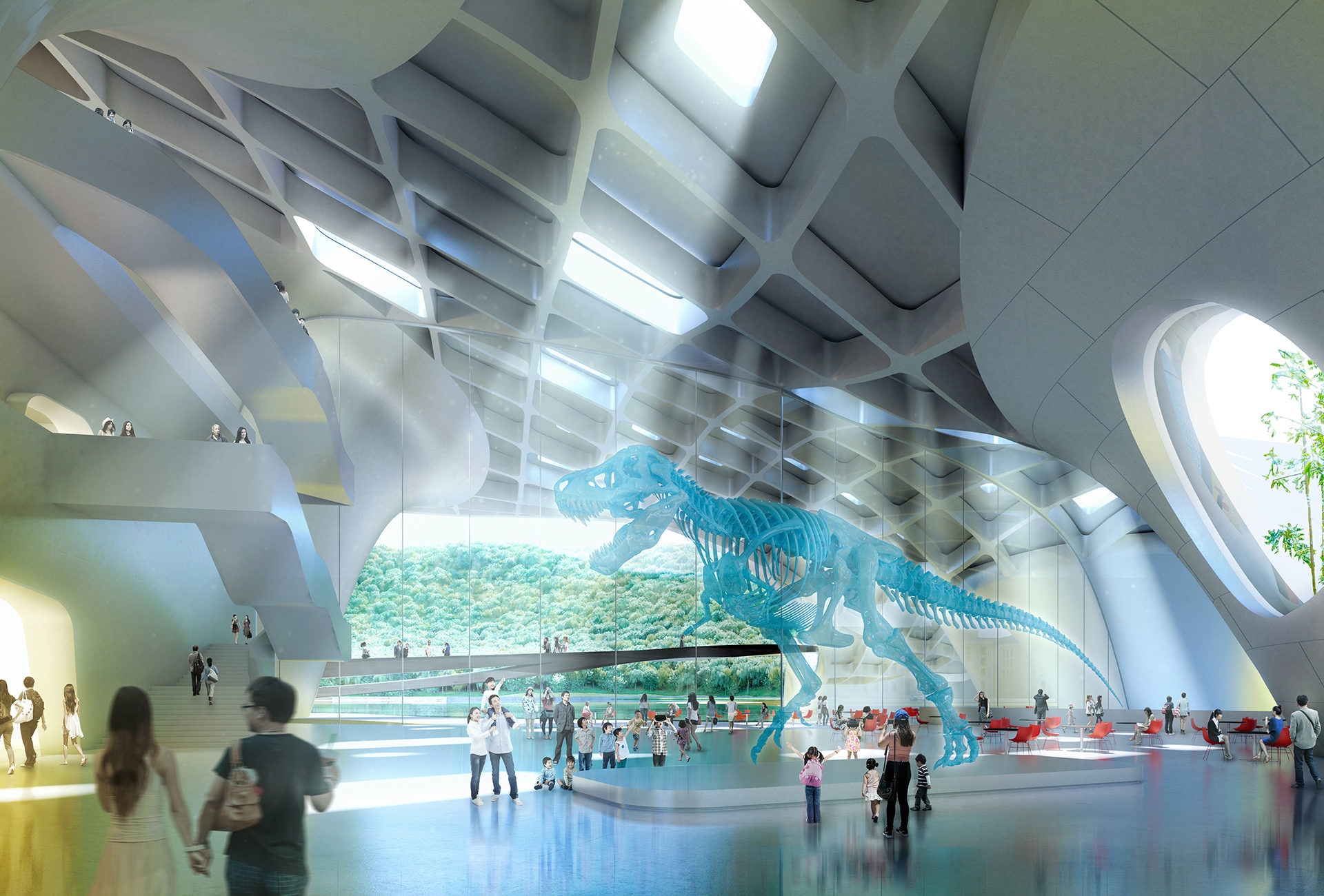 The Permanent Exhibition zone takes cues from the Tom Leader Studio-designed Shishan Park and affords multiple paths throughout the space. The Great Hall presents an unlimited opportunity for future curators to organize the space, and the perimeter of the building provides multiple access points, allowing different museum programs to operate independently from the primary exhibition space. The Children’s Science Park will be an Exploratorium—a hands-on and dynamic activity zone where children can learn to code and program video games, experience the wonders of electricity, and even climb on the moon’s surface. The Temporary Exhibition Hall is divided into three 1000 m galleries that can be combined into one large space as needed.