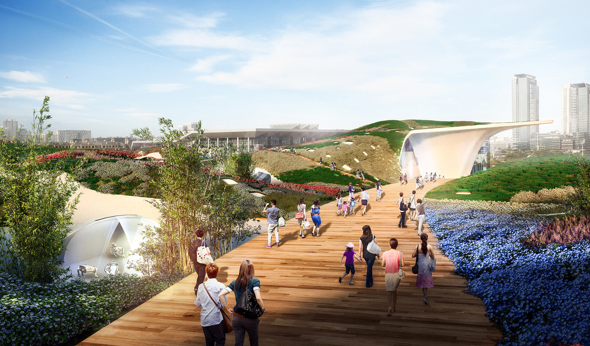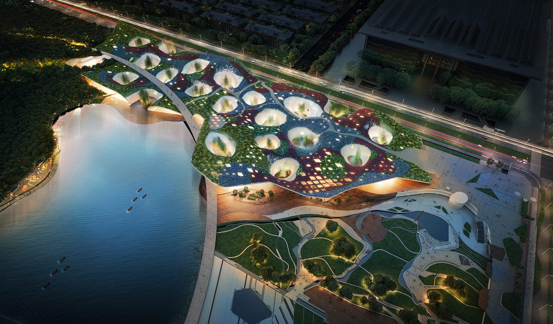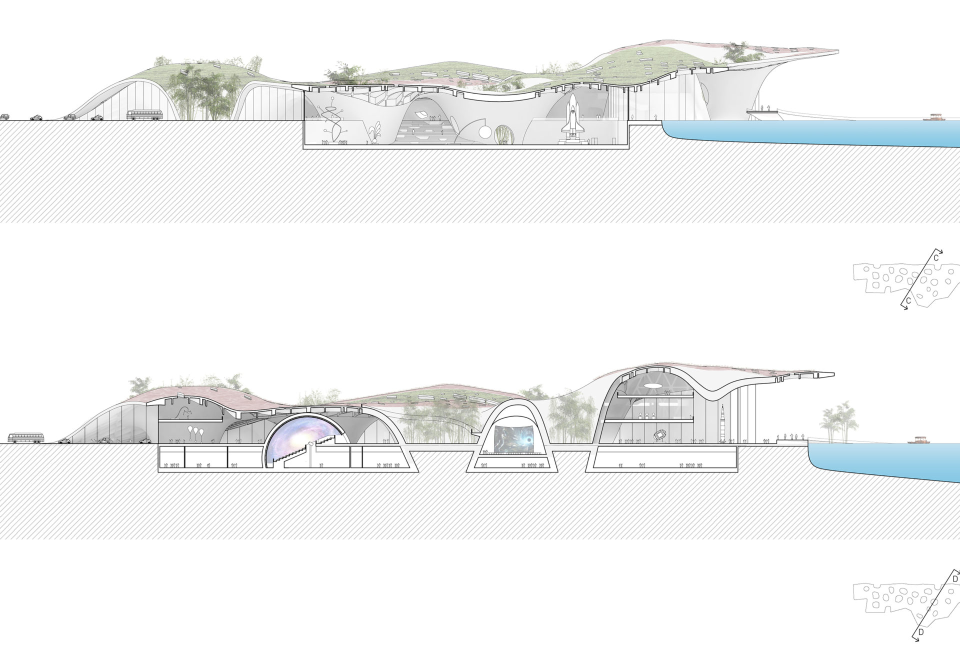 The museum’s roof, responding to the park’s Ring Road, is landscaped to become an extension of the park, and traversed by walking paths connecting the park with the city. The bamboo gardens in the sunken courtyards connect the underground interior spaces to the surrounding park above. The larger program areas—including the Children’s Science Park, Temporary and Permanent Exhibitions, and the Industrial pavilion—are distributed across the site. The four theaters provide multimedia accessory spaces for exhibition zones and can be accessed by the public even when the museum is closed, while the activity, auxiliary, and back of house programs serve the museum’s more functional requirements.