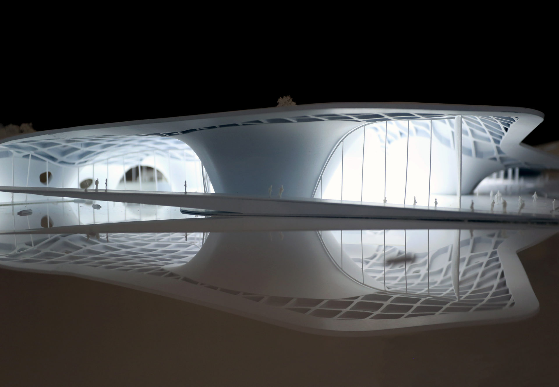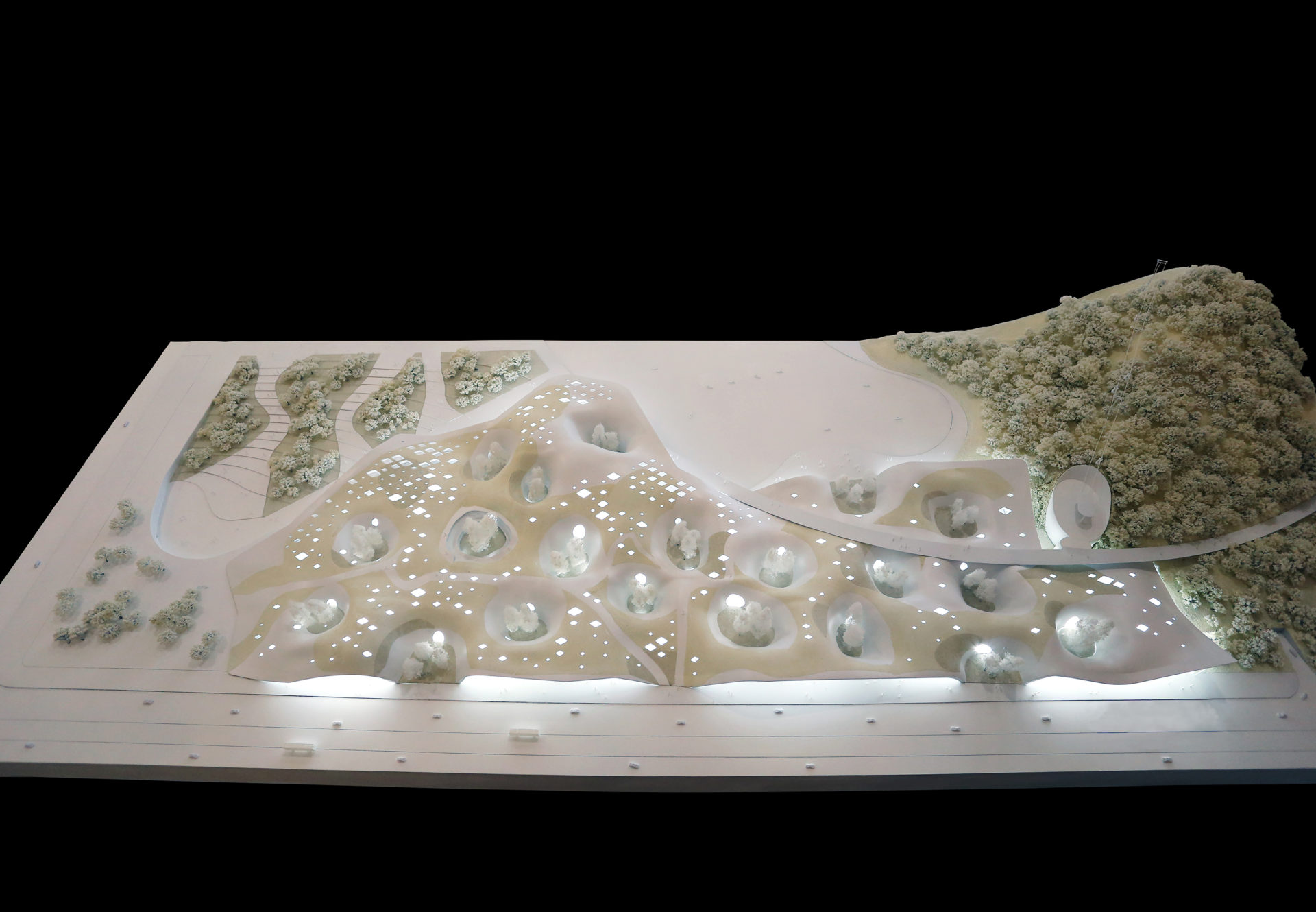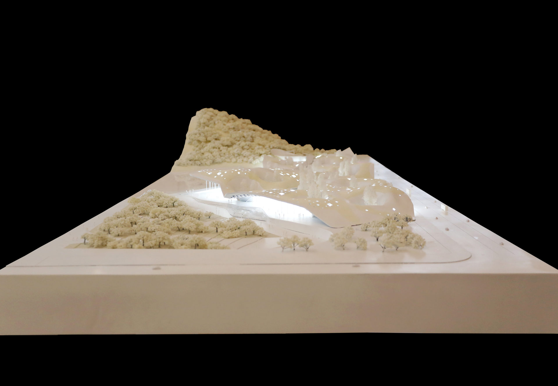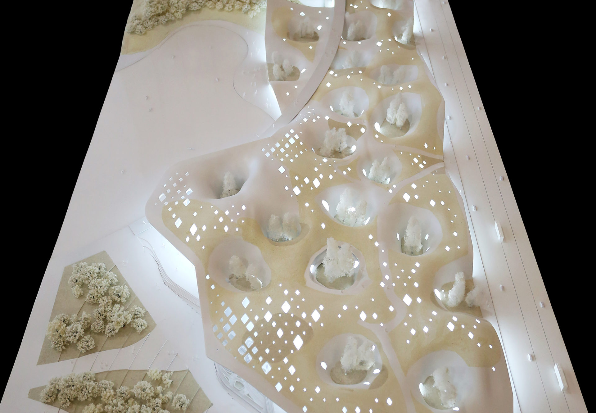kdA’s design for the new museum utilizes integrated landscape strategies as the primary means of architectural form making: a large park surface is pressed into piers to provide structural support and zones of planting. This topographic form encourages the park to continue over the entire building surface, while also providing views of the surrounding mountain and lake. Seen from above, this dynamic surface is akin to another planet: expansive, abstract, and geometric, taking on characteristics of planetary craters.