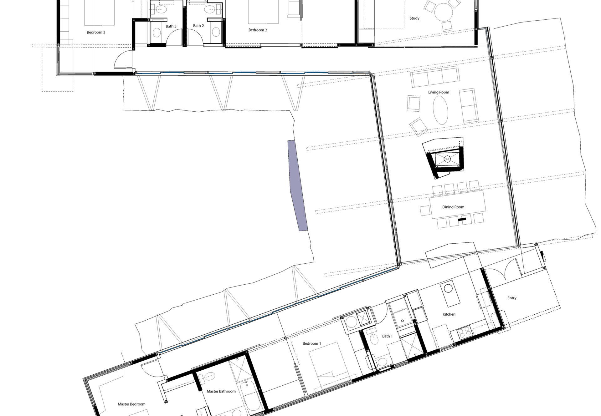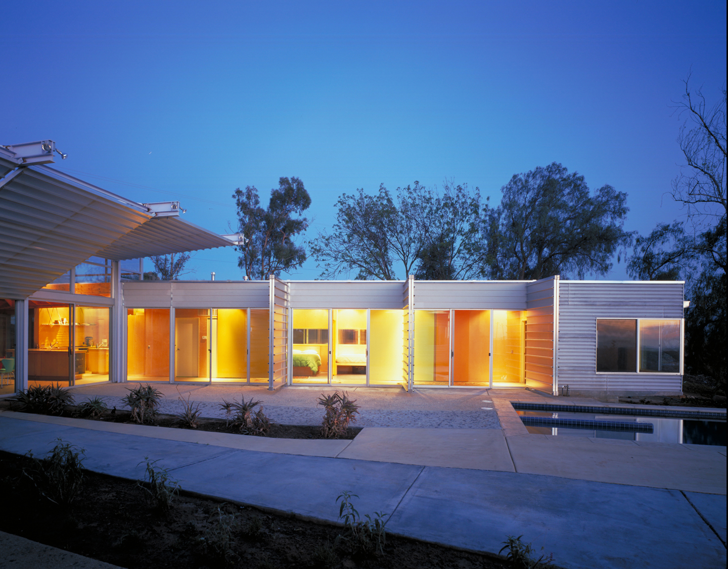 The perimeter of the building is programmed as the primary environmental conditioning system of the residence. This is achieved in two ways; in the refractory capacity of the corrugated concrete board (inert, nonconductive, nonreactive) and in the reflective nature of the formed aluminum panels. In addition to protecting the large glass surfaces from direct sunlight (and wind driven embers), the panels create huge shaded areas immediately outside the main living space. These intermediated spaces allow the house to remain open without being exposed; they function like a storm vestibule does in a cold climate. The design of the shallow, or flat, roof surface—a heat mitigation strategy typical of residential construction in arid climates with little or no rainfall—is inspired by the work of mid-century modernist Cliff May, the architect best remembered as the developer of the now ubiquitous California ranch house.