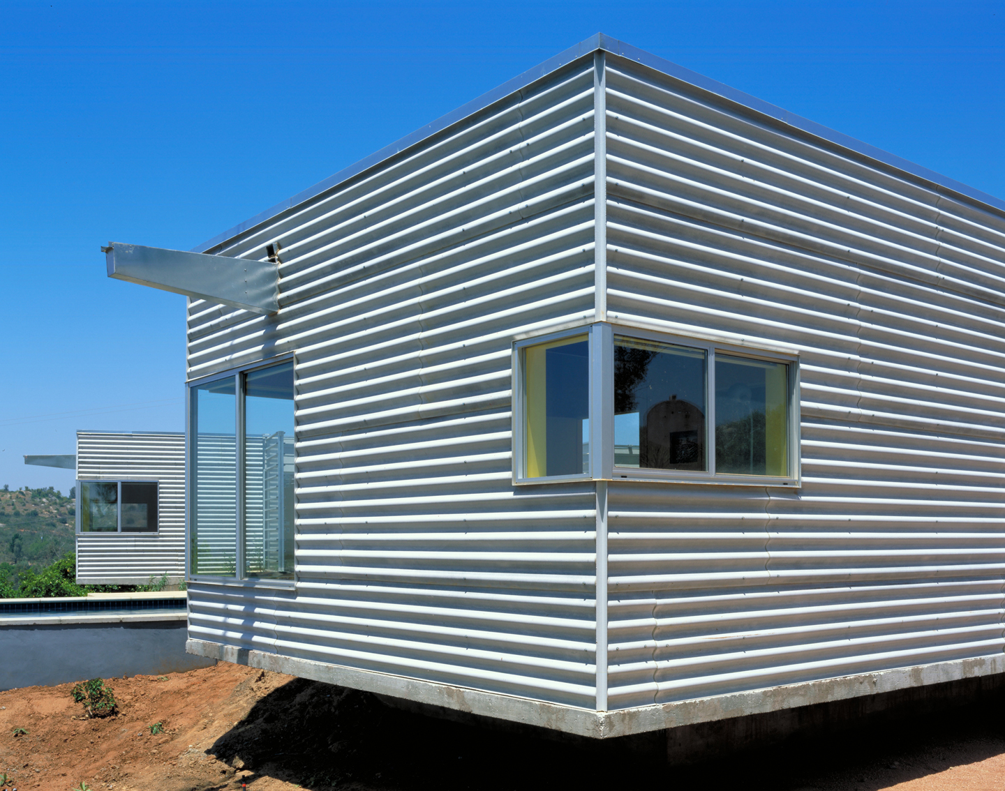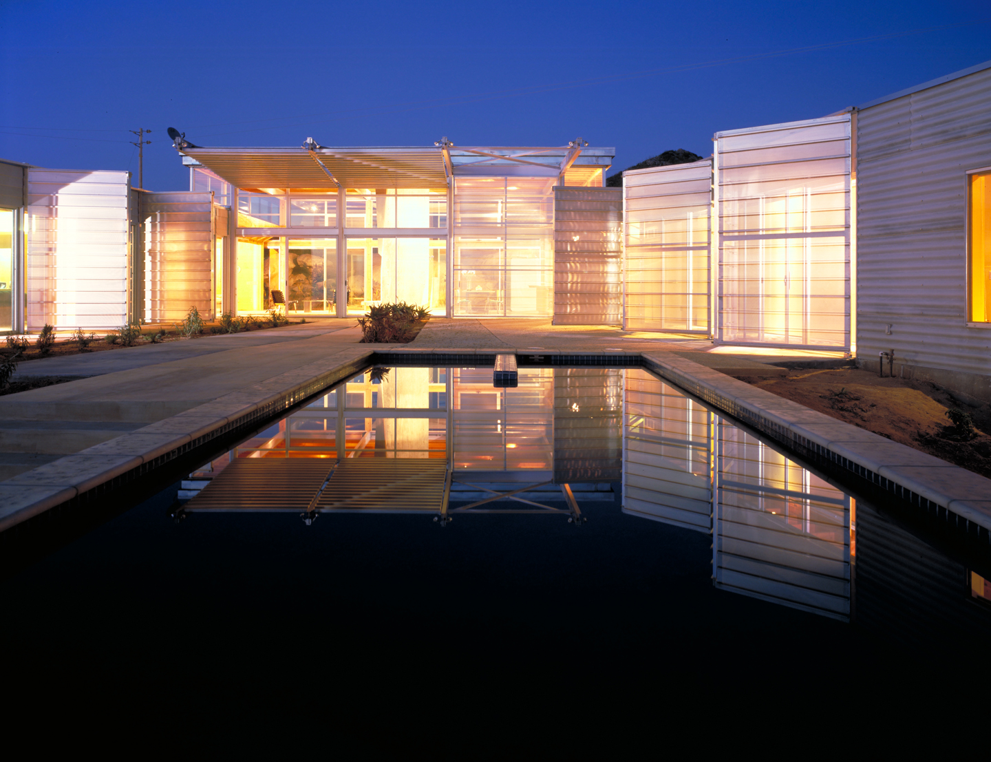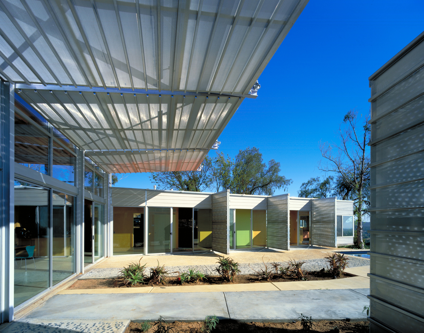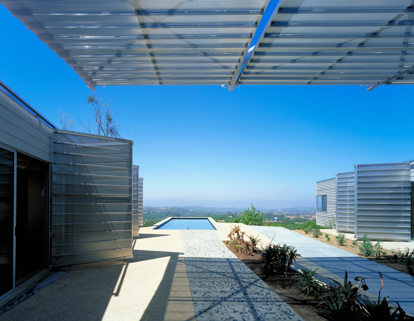 One of the firm’s earliest completed projects, the Valley Center House is a 2800SF single-family residence that replaced an early 20th century ranch house that burned in a wildfire in November 1996. Located in Valley Center, CA (a small rural community 40 miles north of San Diego in the foothills of Palomar Mountain) and completed in 1999, this home is a singular response to the extreme particulars of the site’s immediate arid climate and the heightened geographical risk of a severe wildfire. Grounded in a progressive approach to material most evident in a dynamic, movable façade that blends the refractory capacity of corrugated concrete and the inherent reflective capacity of aluminum panels to provide exterior fire protection and an improved quality of life to the interior, the Valley Center House remains a relevant architectural case study as the threat and frequency of wildfires continues to increase both on a regional and global scale.