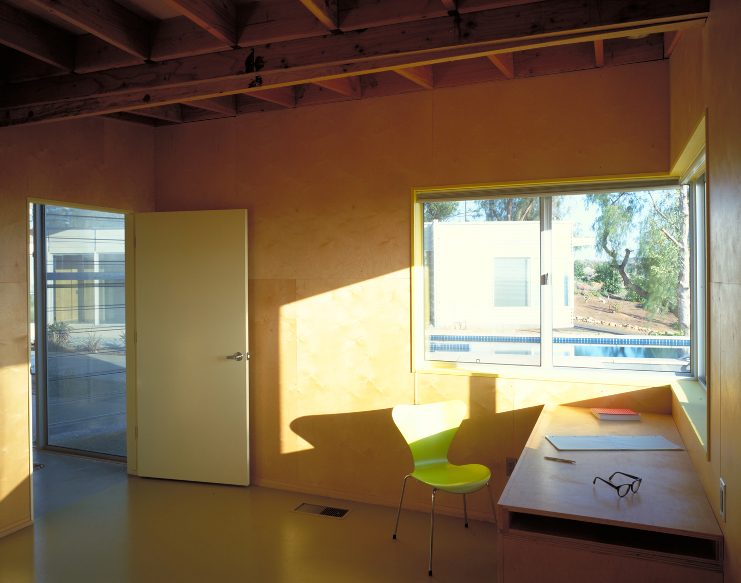 The house is organized as two wings of sleeping quarters, relatively opaque to the exterior and flank a large living/dining room that is otherwise entirely glazed. These three building elements form a courtyard that opens to the grove below and the coastal view beyond. A swimming pool notches into one side of the courtyard. The exterior of the two wings is sheathed in corrugated concrete board; large openings to the courtyard are covered with bi-folding perforated metal panels. Sliding panels allow the sleeping quarters to open fully to the courtyard beyond. A continuous cantilevered concrete slab allows these elements to float above the site, at the level of the treetops of the surrounding citrus orchard. The interior wall surfaces are birch plywood, and this material continues onto the ceiling sheathing where it is visible between exposed joists.
