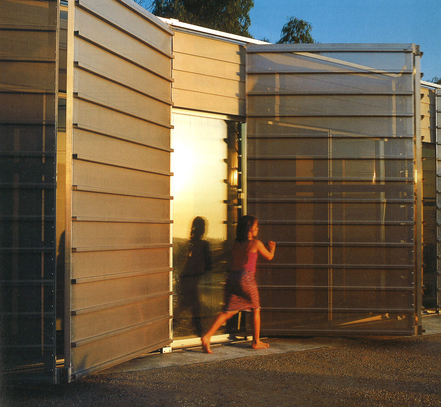 The perforated aluminum panels are operated as large bi-folding doors on the north and south facing surfaces of the courtyard and as large operable awnings panels on the east and west facing surfaces of the main space. In addition to controlling the sun, the awning panels are adjustable as daylighting devices. During the cool part of the year, the panels can be used to reflect sunlight onto the ceiling of the living/ dining room.