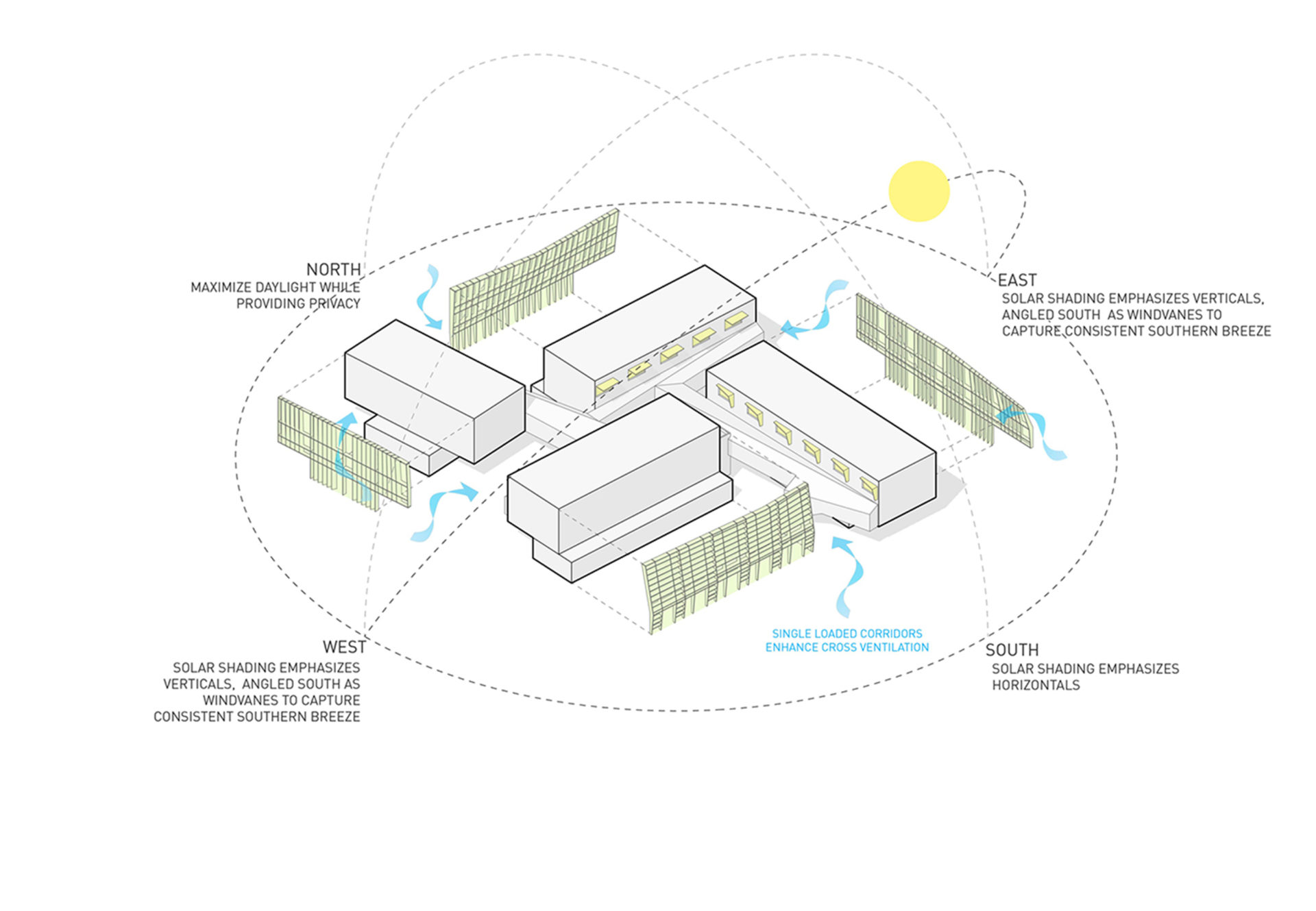 Clusters of housing are oriented, some off axis, to prioritize open space and form natural neighborhoods that encourage socializing, use of outdoor space, and connection among residents. This pinwheel arrangement for the housing clusters has other benefits. By organizing the project into multi-story townhouses over single story garden units, circulation is minimized. Each unit is provided with two or three exterior walls, allowing for natural light and ventilation flows of each unit. The garden level units are offset from the townhouses above, opening to the landscape while creating private terraces for upper level units.