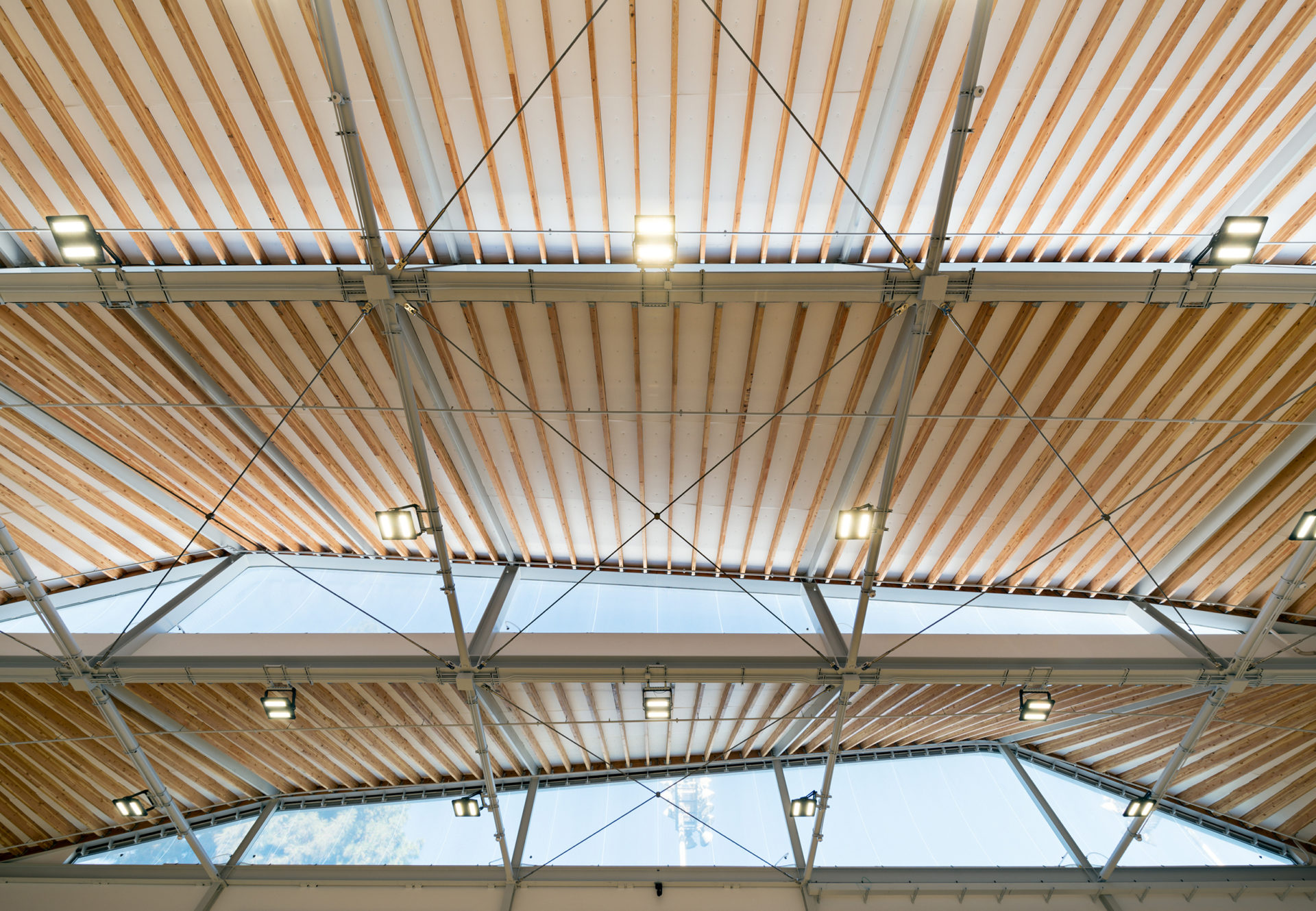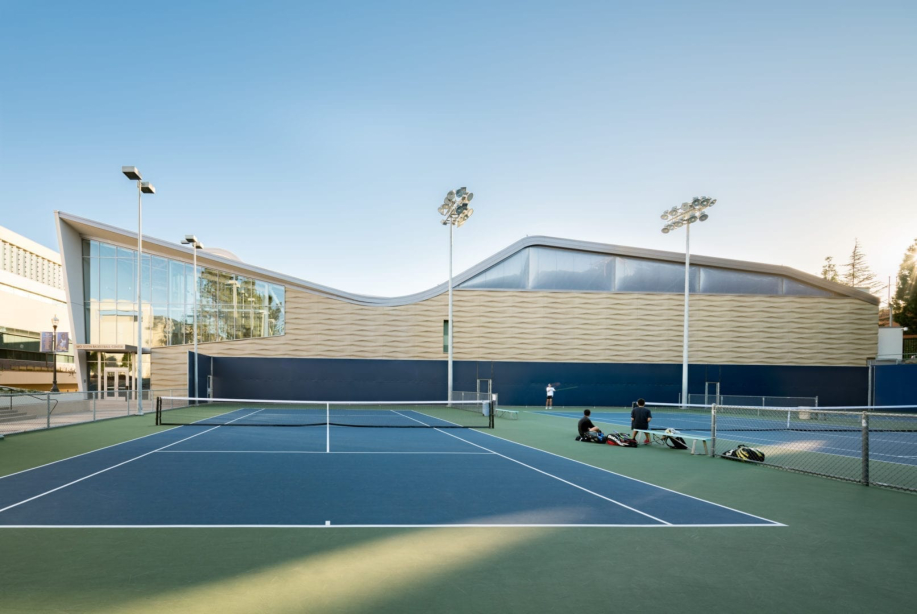 At the UCLA Ostin Basketball Center, each practice court is lit by three large clerestory windows created by the undulating roof. These windows are made up of ETFE cushions, a double-layer film that is inflated with air. The ETFE system has higher insulating properties and is lighter in weight than insulated glazing units, as well as being more economical, easily recyclable, and long-lasting,