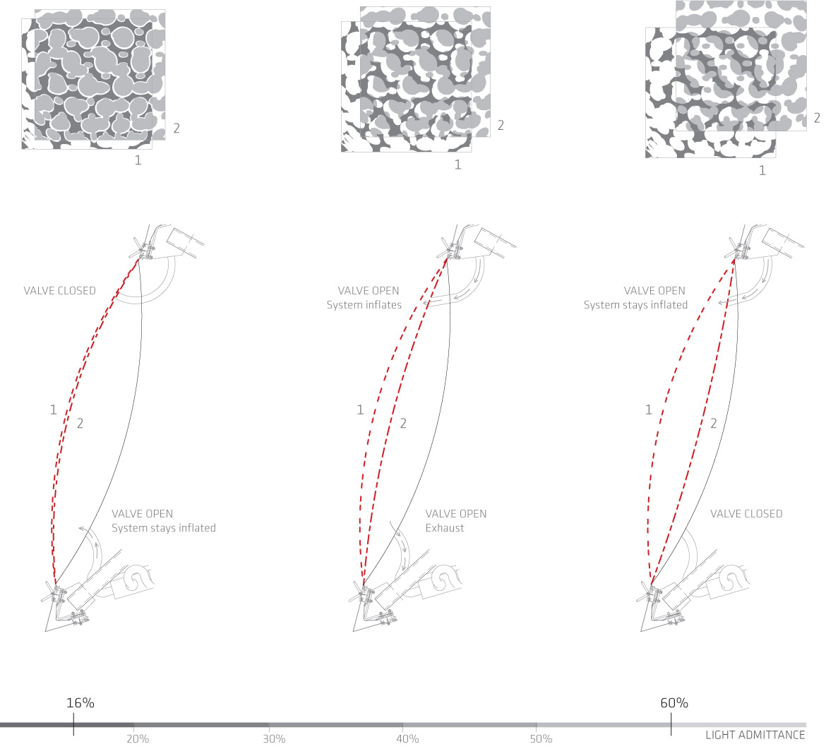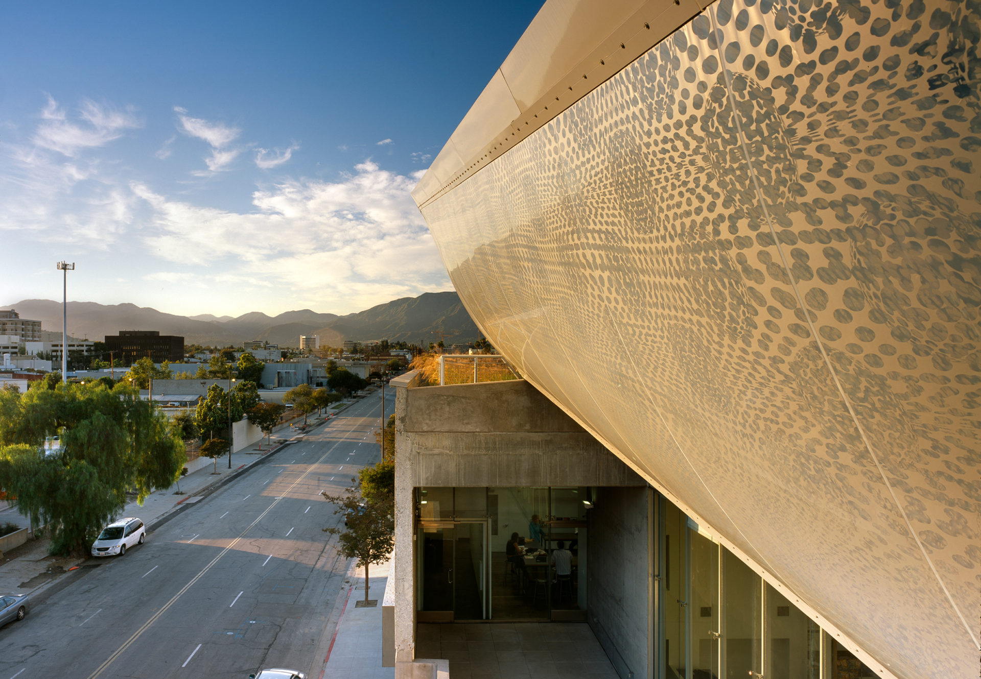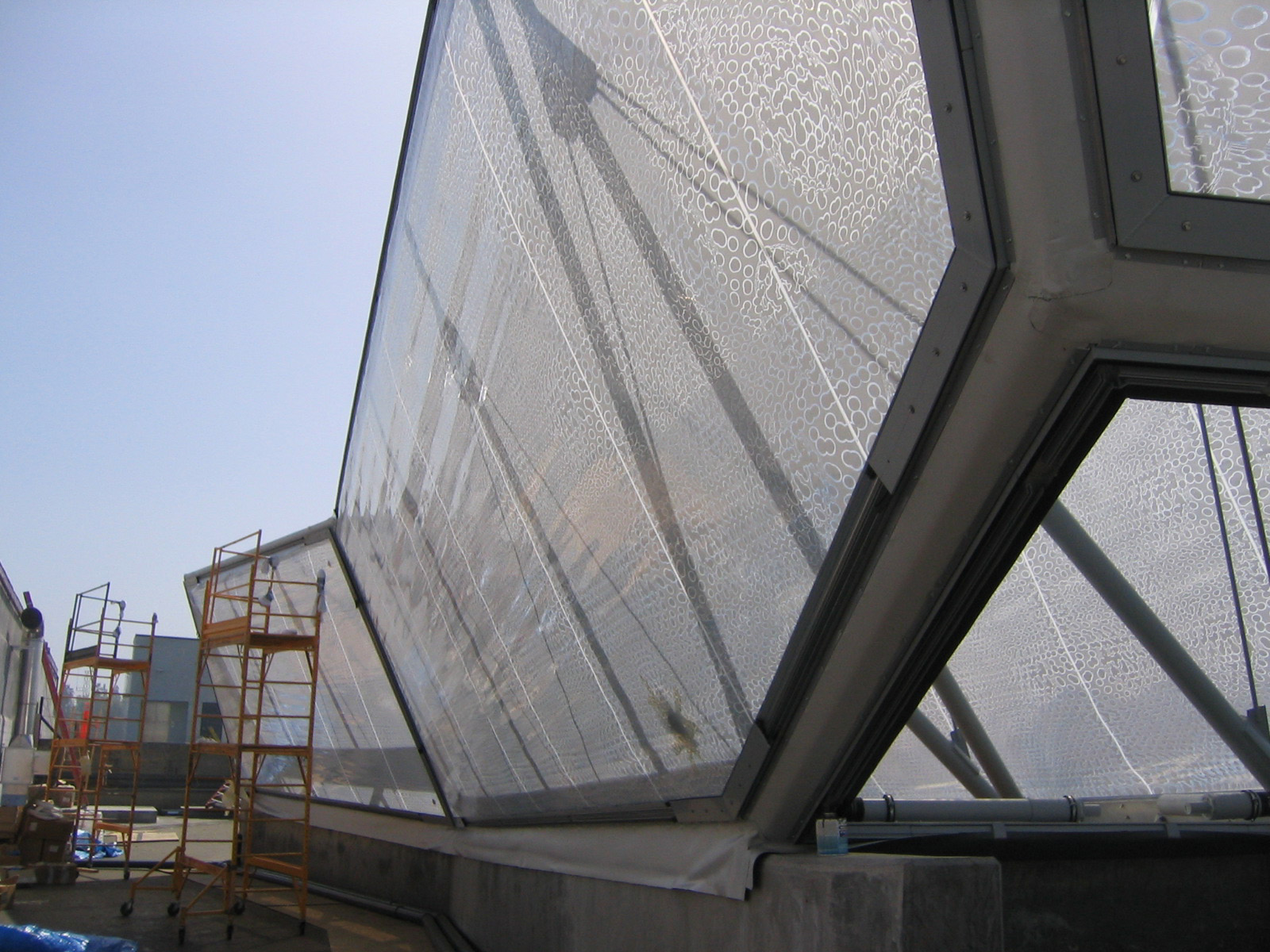 Designed for the ArtCenter College of Design South Campus, the skylight system is built of translucent ETFE films stretched on a custom-designed structural frame. Three thin printed layers of Foiltec (a Teflon-coated polymer) comprise the pillows within the structural frame. Via compressors these layers are inflated or deflated to adjust the amount of natural light and heat entering the building.