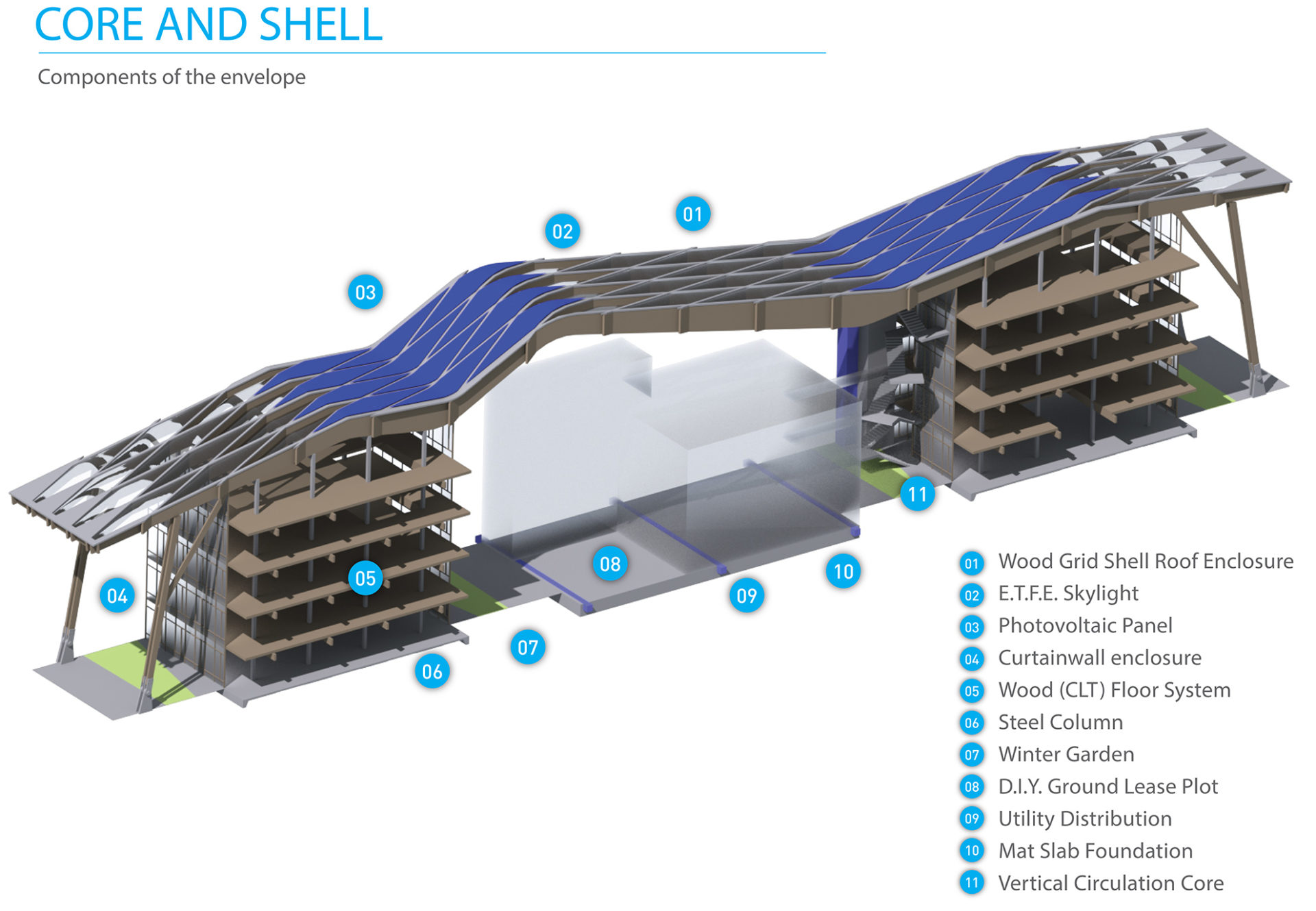A series of dedicated study and research buildings—their widths optimized for natural lighting and ventilation and their five- to six-story volumes constructed by conventional means or via cross-laminated timber columns and floor framing—comprise the primary planning modules of the new campus. Cores located at the perimeter allow for the series to be subdivided vertically or horizontally between single or multiple departments or tenants. Circulation is located primarily at exterior edges in dialogue with the spaces beyond.