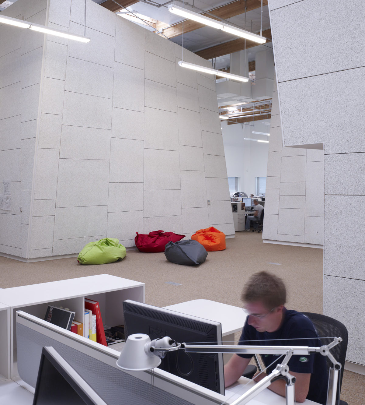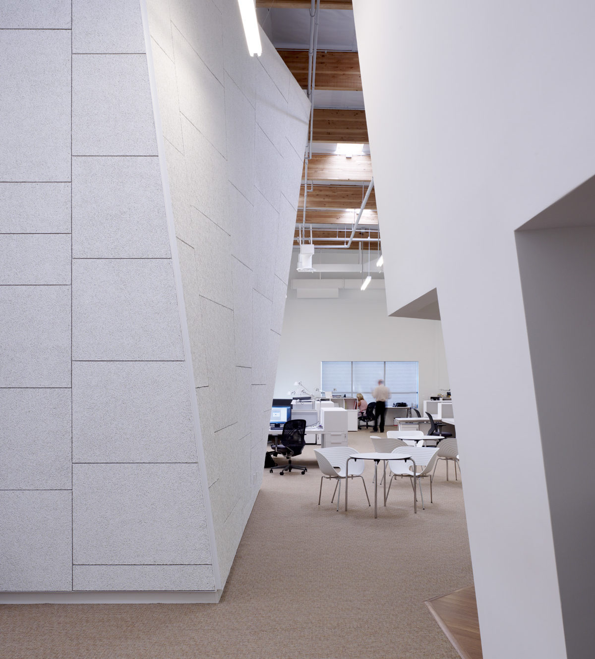 Most critically the neighborhoods are non-hierarchical, and visual connections were established between the workstation neighborhoods and project rooms, providing the client with the desired modern collaborative workplace. A material library and café are sited on the periphery, encouraging colleagues to walk past and provide feedback on various studio projects.