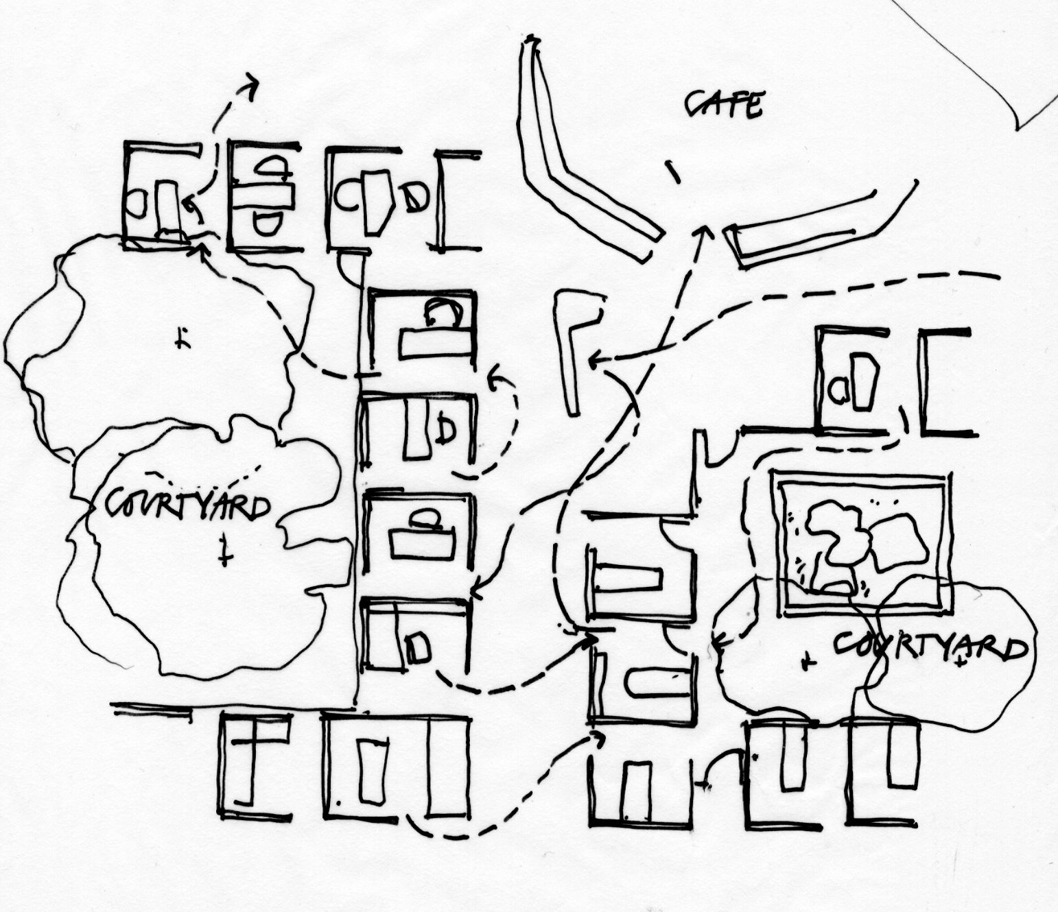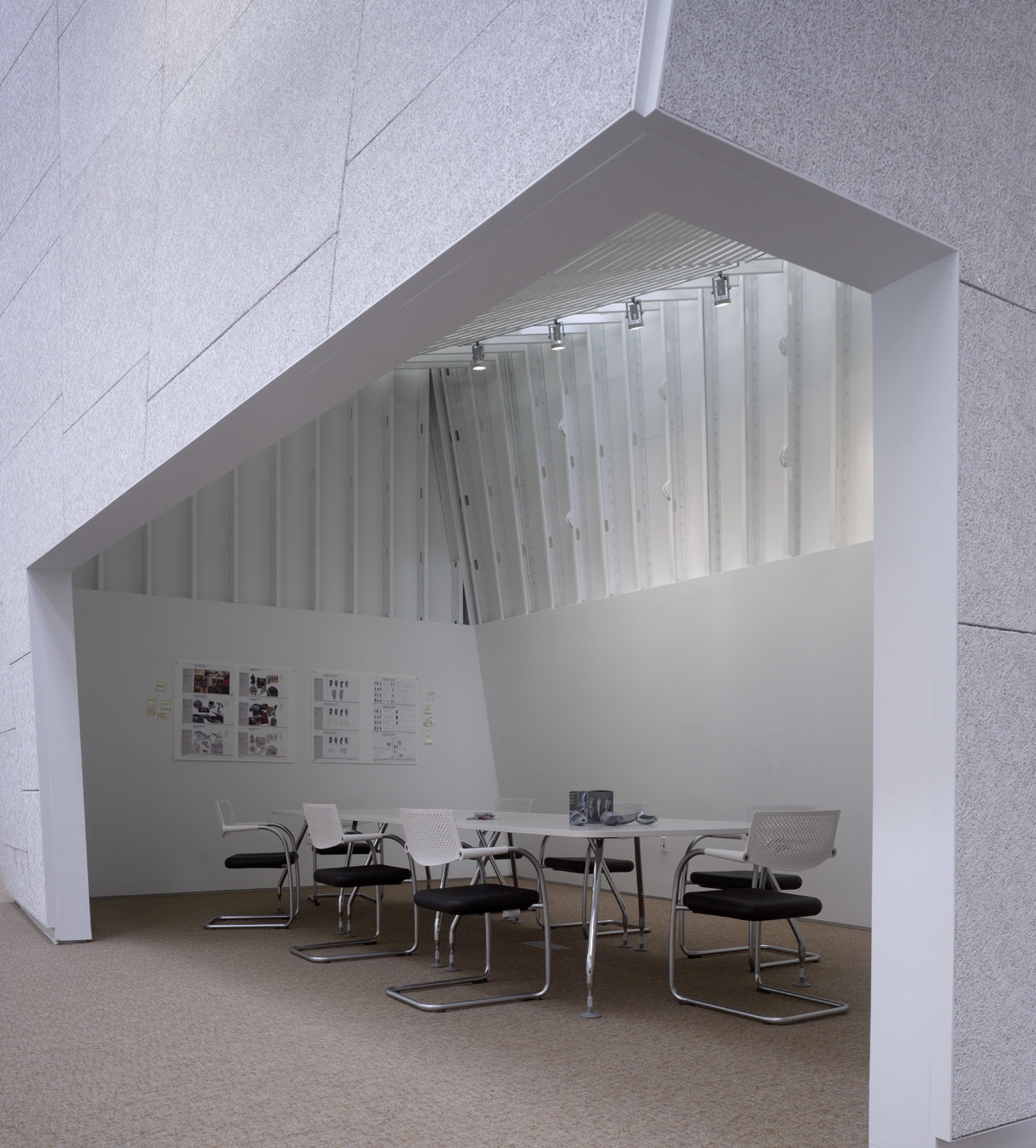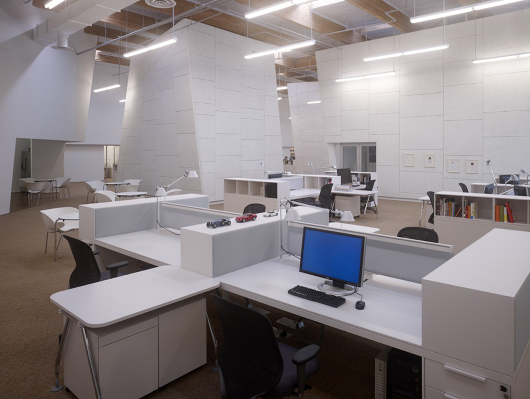 In plan, the studio is oriented towards the large car-sized 3D milling machine in the shop area, renovated as part of Phase I. Distinct neighborhoods of flexible workstations were established with a core of project rooms, providing pin-up space on both the outside and inside middle of the studio. Their configuration allows the space between them (or town square) to function as a fourth project room.