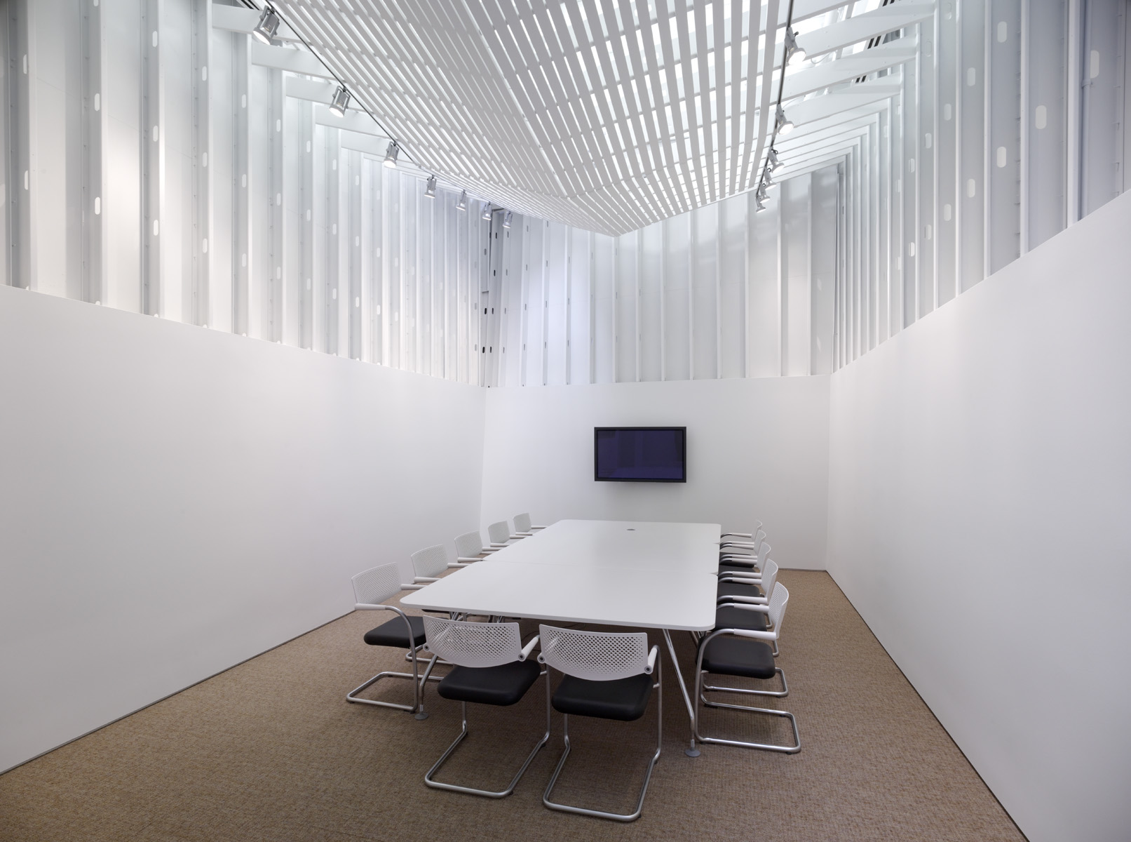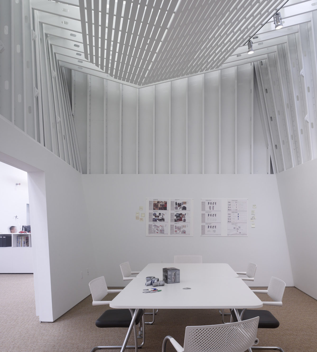 BMW Group DesignworksUSA requested that their design process be reflected in the workspace. They wanted all surfaces to be workable to accommodate brainstorming and be a non-prejudicial clean slate. Workstations were installed with drop down desks for cooperative sketching, and the project rooms were clad in Tectum, allowing photos, note paper, and ideas to be posted on both the inside and outside. Skylights were revealed once the drop ceiling was removed, allowing natural light into the studio.