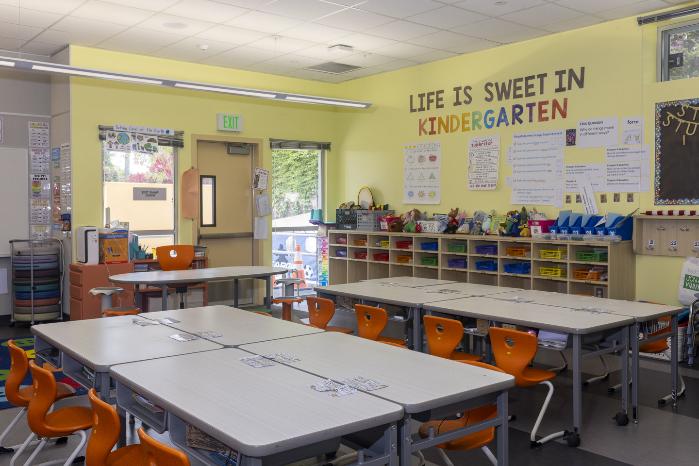 The small footprint new building minimizes the use of limited play space while creating distinct play yards for the different age groups of students and activities and incorporates an edible schoolyard garden previously developed by the school’s active parent population. North facing skylights addressed the challenge of limited wall surface available for glazing while providing varied sections in the classrooms.