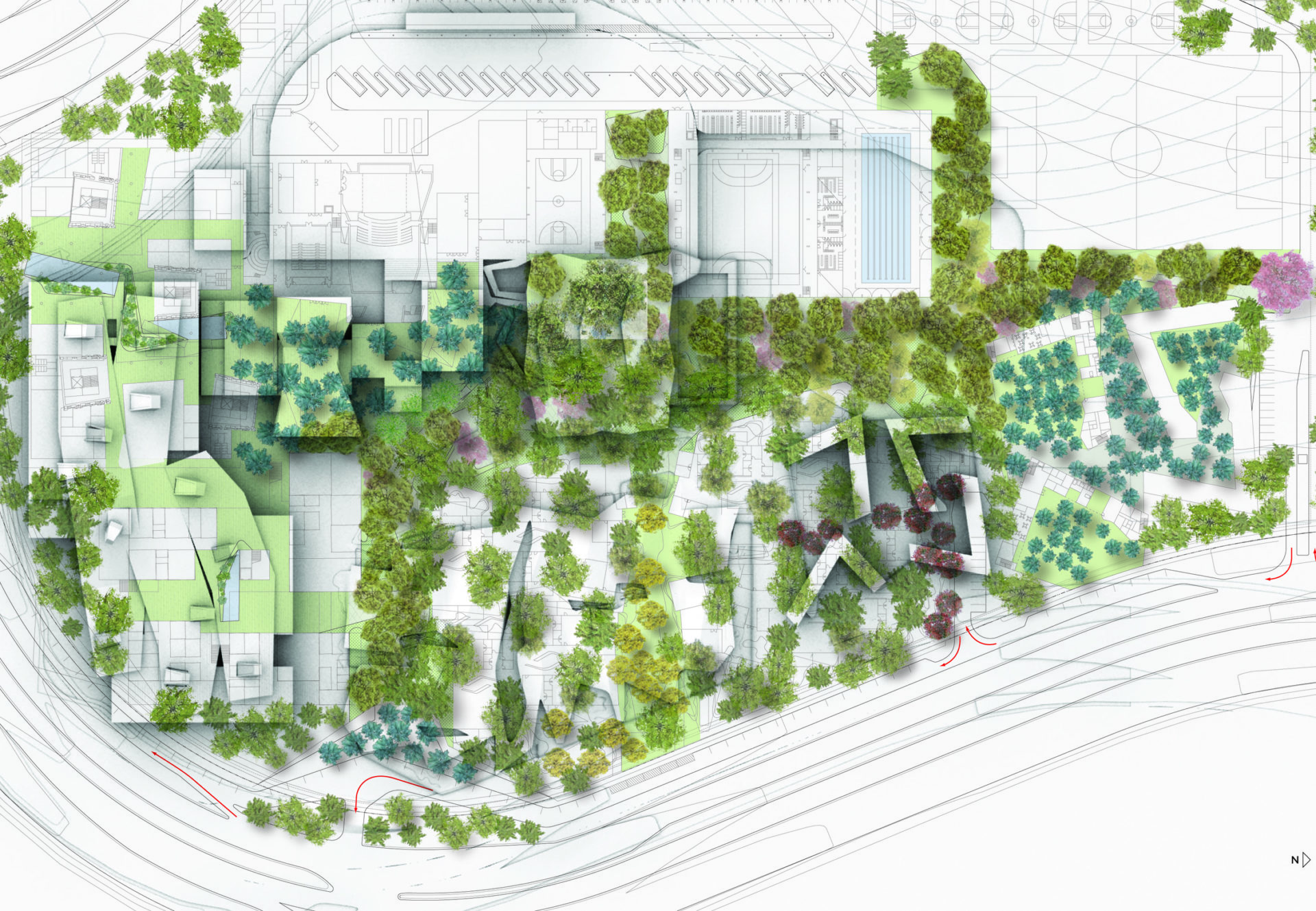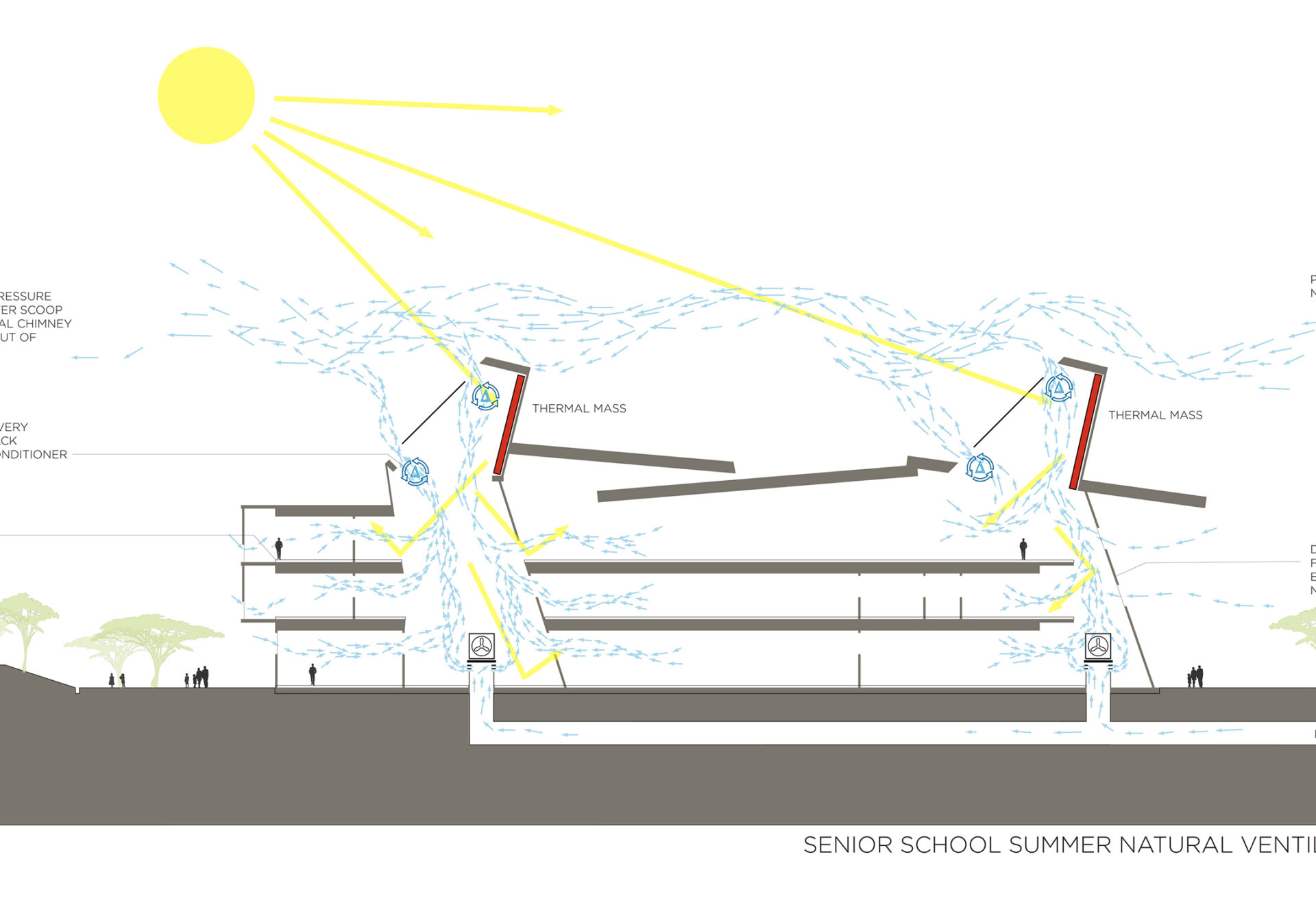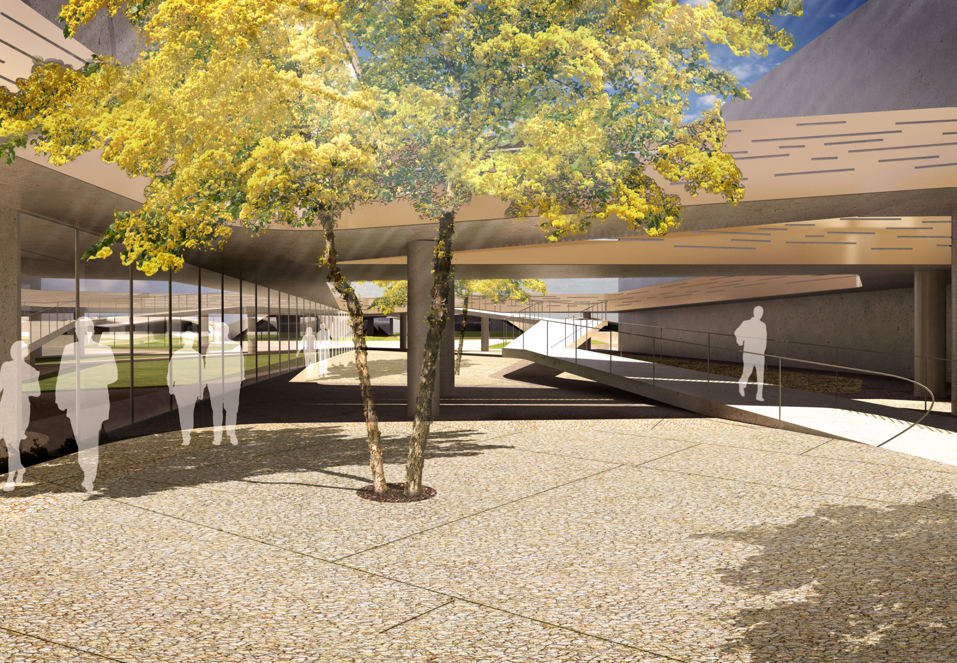 The five precincts are connected by the continuous and interlocking landscape. The palm grove in the residential precinct gives way to the acacia woodland that stretches across the campus to the central square, while a wild undulating canopy of trees blends into the woodland floats above the early years school. In both the junior school and senior school the landscape becomes more organized and quiet in scale, reflecting the College’s curriculum. The performing arts and recreation precincts are the gateway from the College to the community and the world, allowing the world to be absorbed by the College.