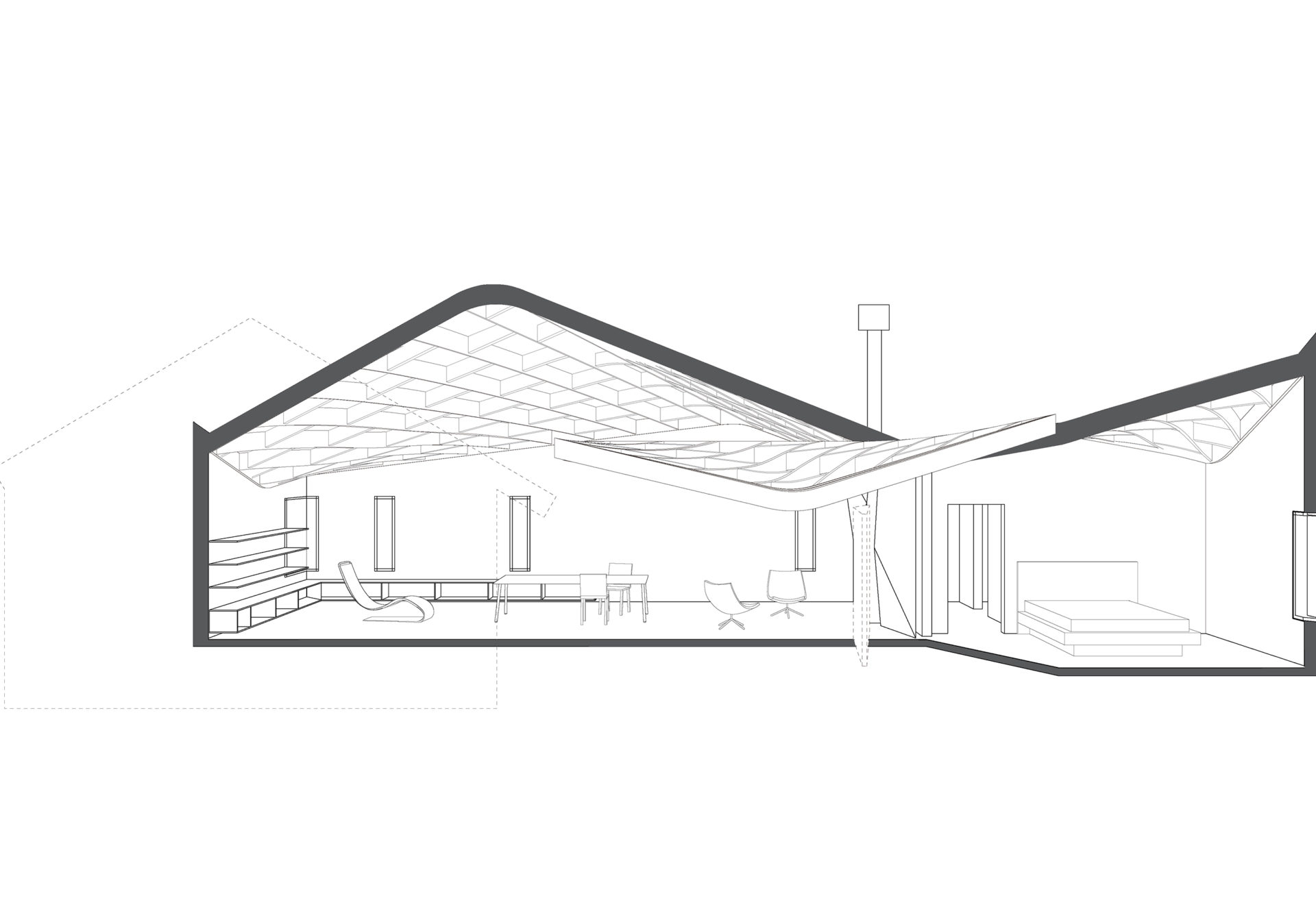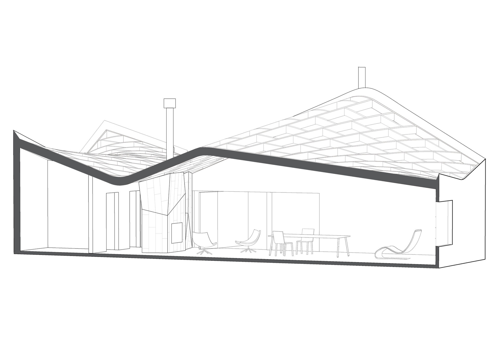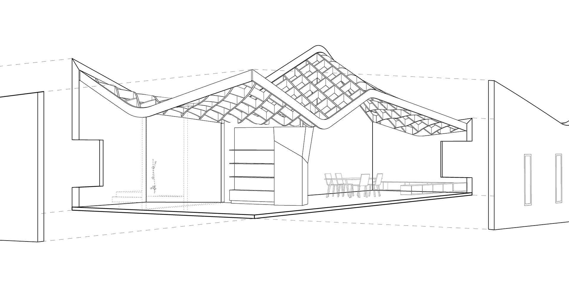 As the house is situated in a remote part of New Mexico, there were few builders in the area capable of addressing the complexity of the geometry of the saddle-shaped roof surface, even over a simple rectangular plan. This was recognized as a significant factor in the execution of the project, so digital documentation and machine shaping were used to control quality and quantities, to simplify layout without the need for patternmaking or field measurement, putting the resources of digital fabrication into the hands of independent, single pickup truck contractors.