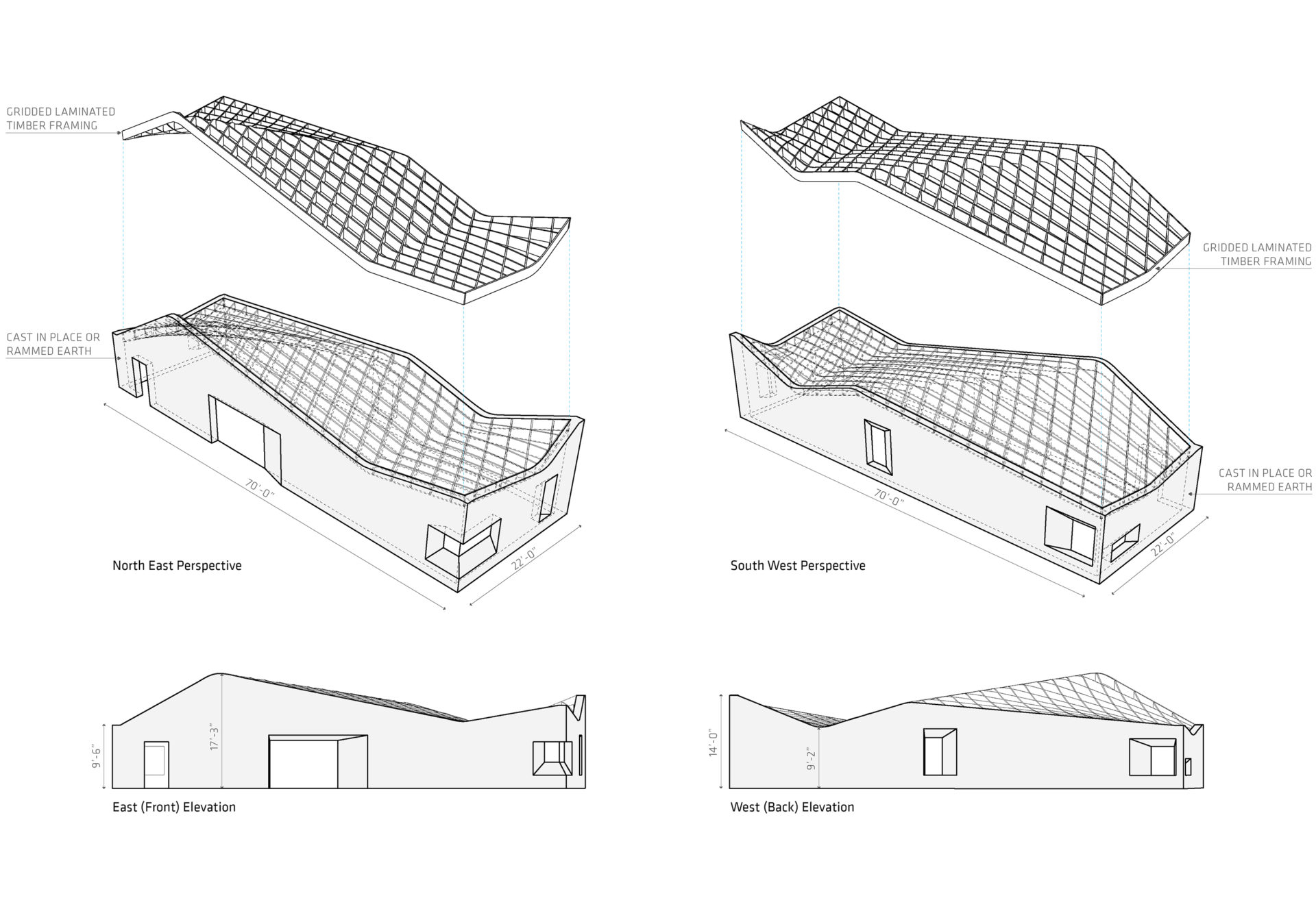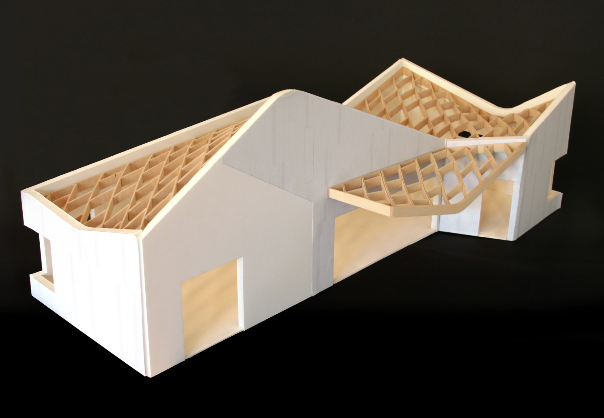 The geometry of the roof framing was optimized to limit spans to 20’ and restrict the finished joist depth to 12”, allowing all roof members to be cut from 20” depth Microlam material. An inventory of joists and blocking that distinguished straight from curved elements was generated to systematize the installation of hundreds of uniquely shaped roof framing elements.