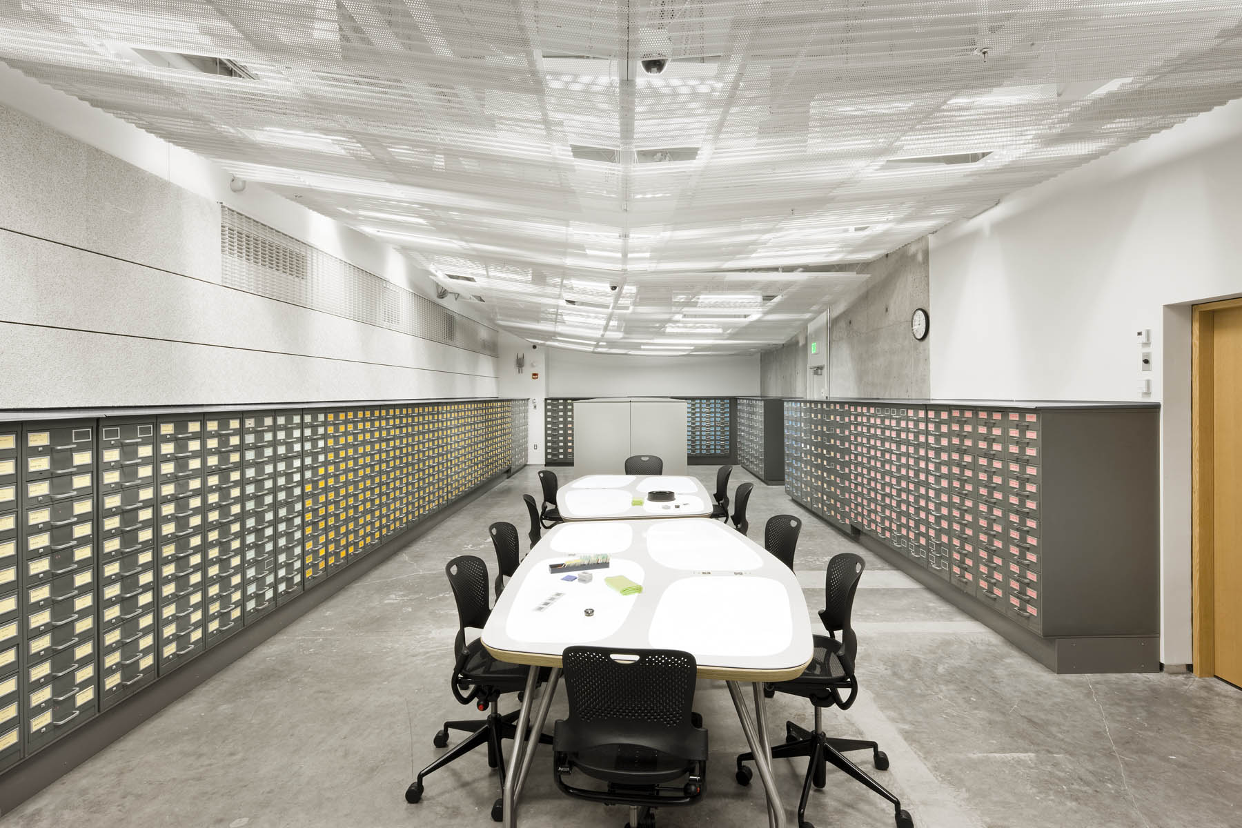 Shelving units and desks are modular and cut in a custom pattern to minimize material waste and reduce installation time. In the slide viewing area, a custom LED light table was created in response to the staff’s requests and input for a better table design. Eight individual pools of light with local controls are integrated into one long table, allowing several people to work at one time.