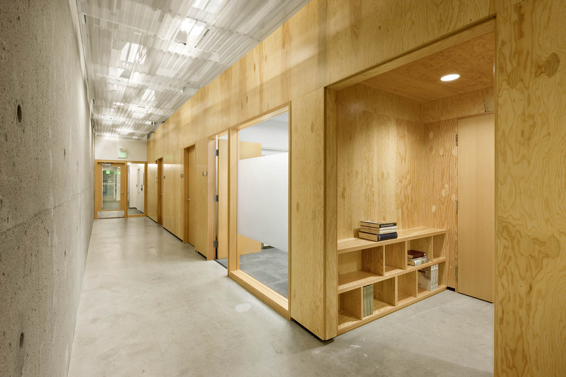 The perforated panels are composed of a standard panel, cut and hung in a custom pattern with a traditional suspension system; this panel and suspension system’s off-the-shelf availability greatly reduced construction costs. All casework, including the media support/information desk, is custom designed with off-the-shelf Douglas Fir AC plywood paneling, which is typically used for structural sheathing.