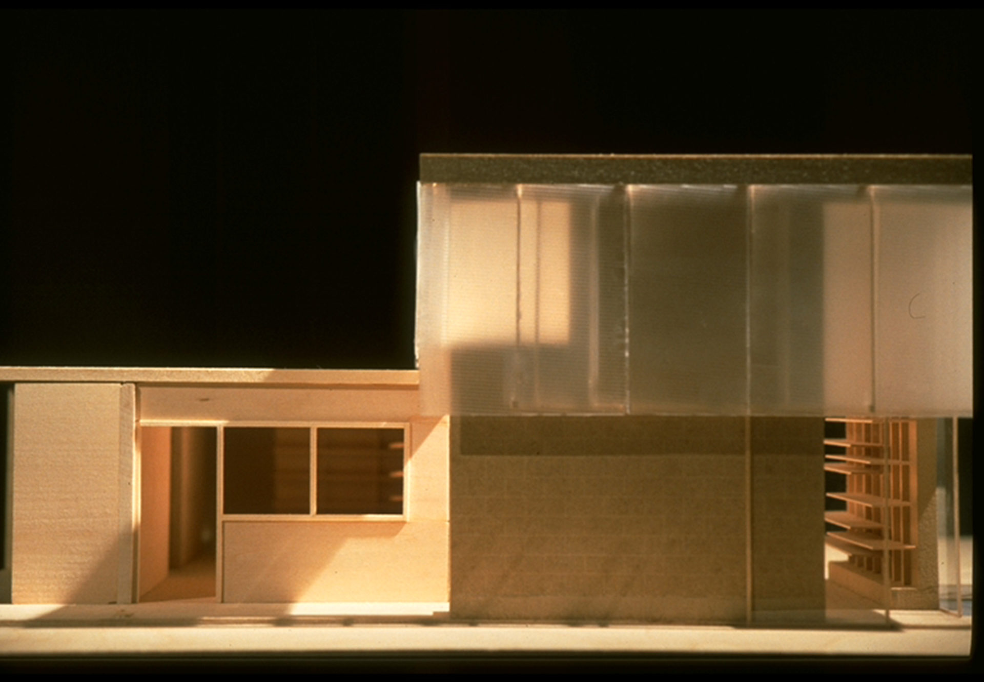 The link between the existing house and the new addition is marked by a pair of sliding plywood panels which serve as moveable displays for hanging textile storage as well as privacy screens. The retractable panels may be positioned into varying configurations, creating an ambiguous boundary between the new construction and the existing house.