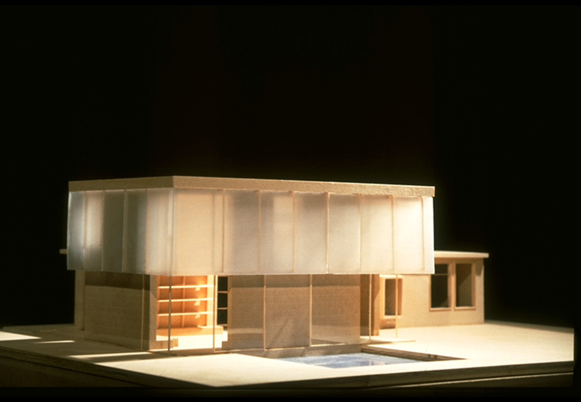 The shell of the new construction consists of four free-standing concrete blocks, each fourteen feet tall, that are open at the corners. To protect an elaborate collection of textiles, the upper perimeter of the building is wrapped in a translucent, two-layer polycarbonate glazing screen that filters light into the house. An automated roller blind prevents excess light from damaging the owner’s collection. The wood joist ceiling is finished with a layer of prefinished maple plywood and casts a soft, reflected light into the living spaces.