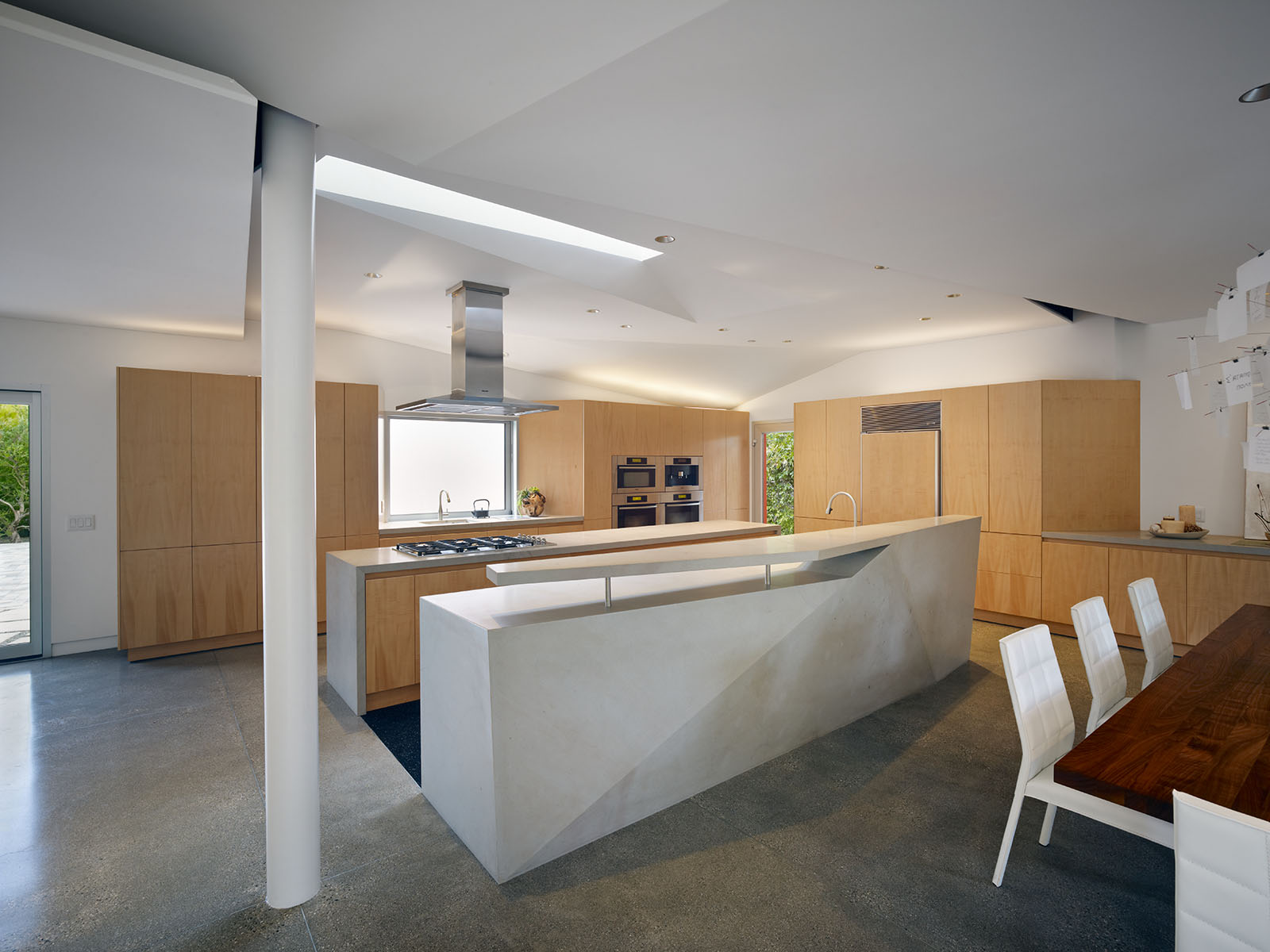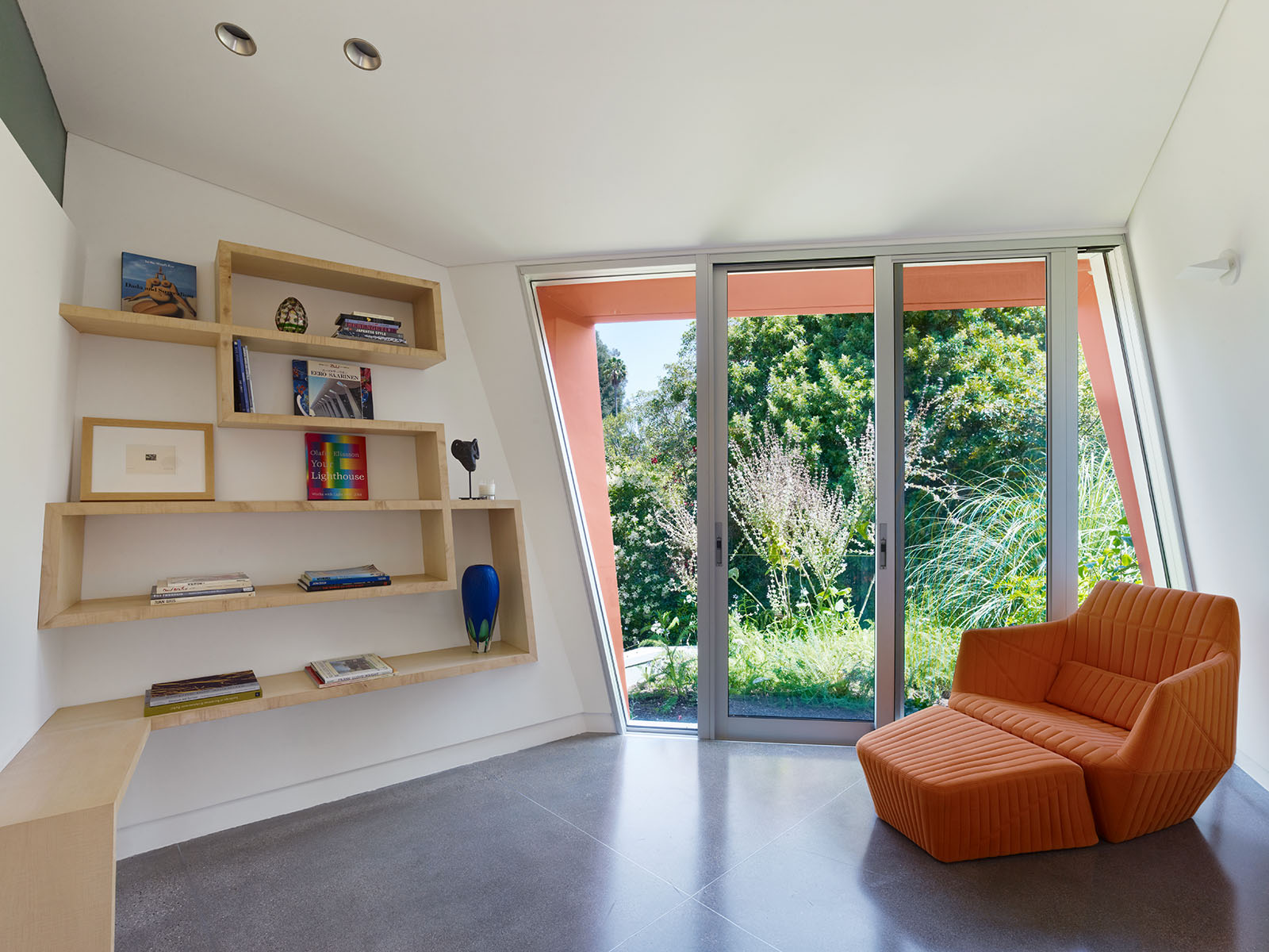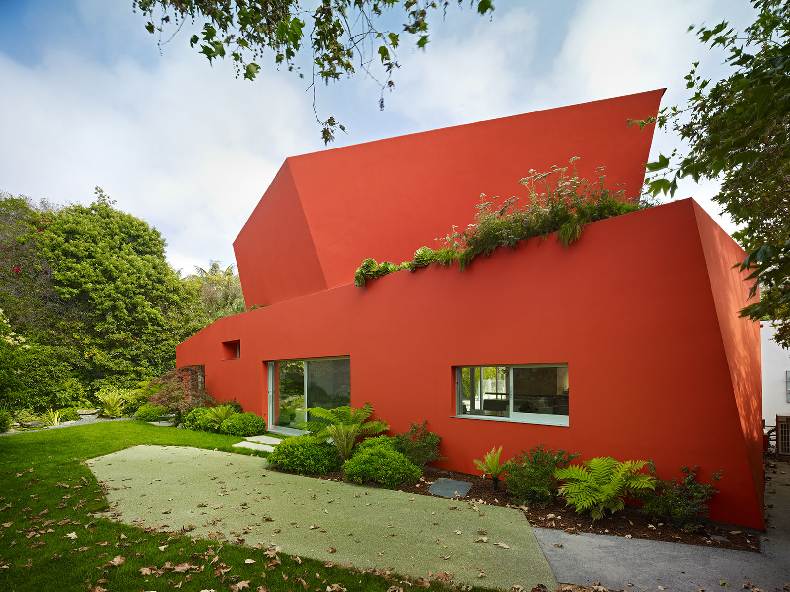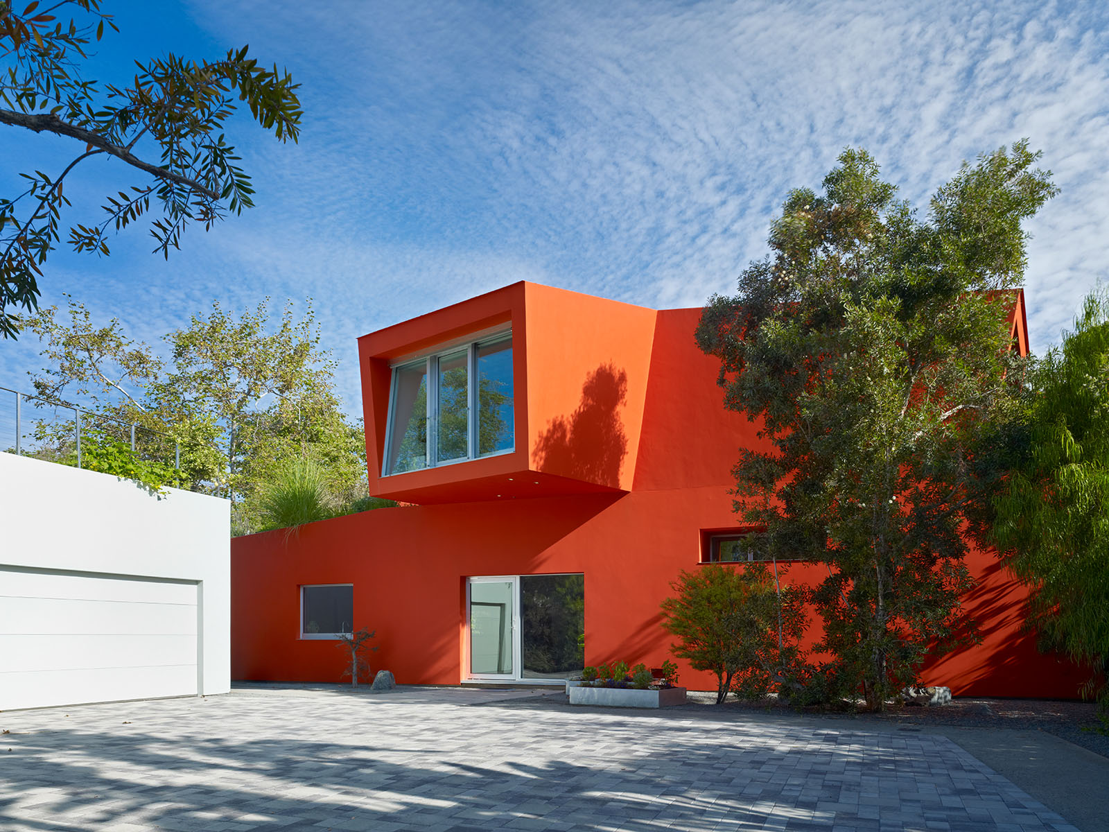 Interior walls on the first floor were removed to create an open, loft-like space in the living/dining and kitchen. Corners of the existing first floor roof and walls have been sliced away to balance the geometries of the new second floor addition. The relatively small bedrooms are made larger by locating one single large opening that looks out to the view and in some cases opens onto the new roof garden. The exterior stucco is coated with bright orange elastomeric to create a monolithic appearance. The garage is planted with an intensive green roof to be used as an herb and vegetable garden.