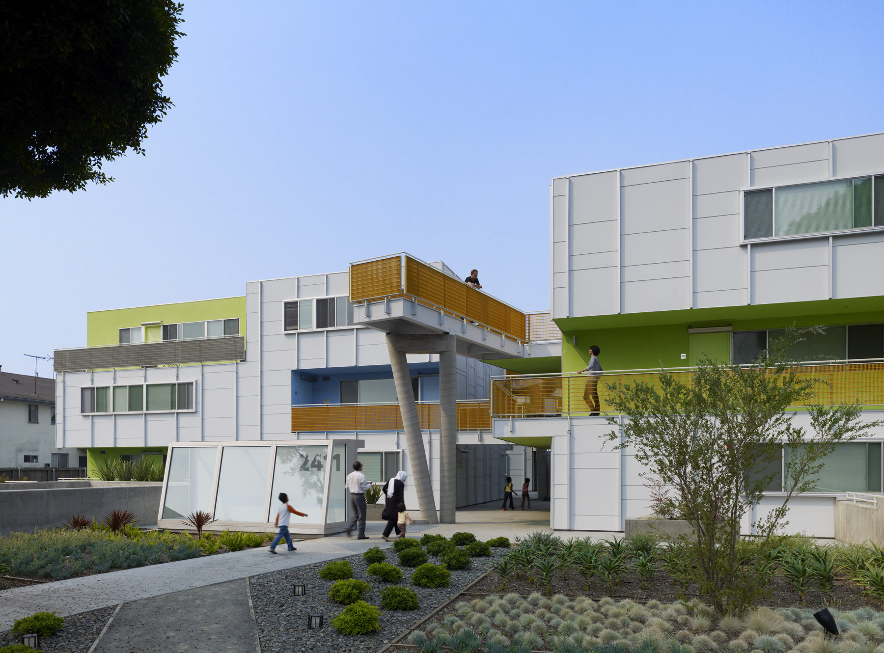The Tahiti Affordable Housing complex, which replaces a deteriorated dingbat complex, provides critically needed housing for low income families in Santa Monica and incorporates important elements from both traditions. The complex balances privacy with community building via a geometric regularity that has been innovatively extruded to grant each unit access to natural light and ventilation. Six three-level buildings are connected by courtyards via ramps and gardens; shared courtyards are distributed throughout giving access to outdoor space to all the residents. The bridge and walkway system connects the buildings and allows residents to interact with neighbors, experience the everyday rhythm of the complex yet maintain individual privacy.