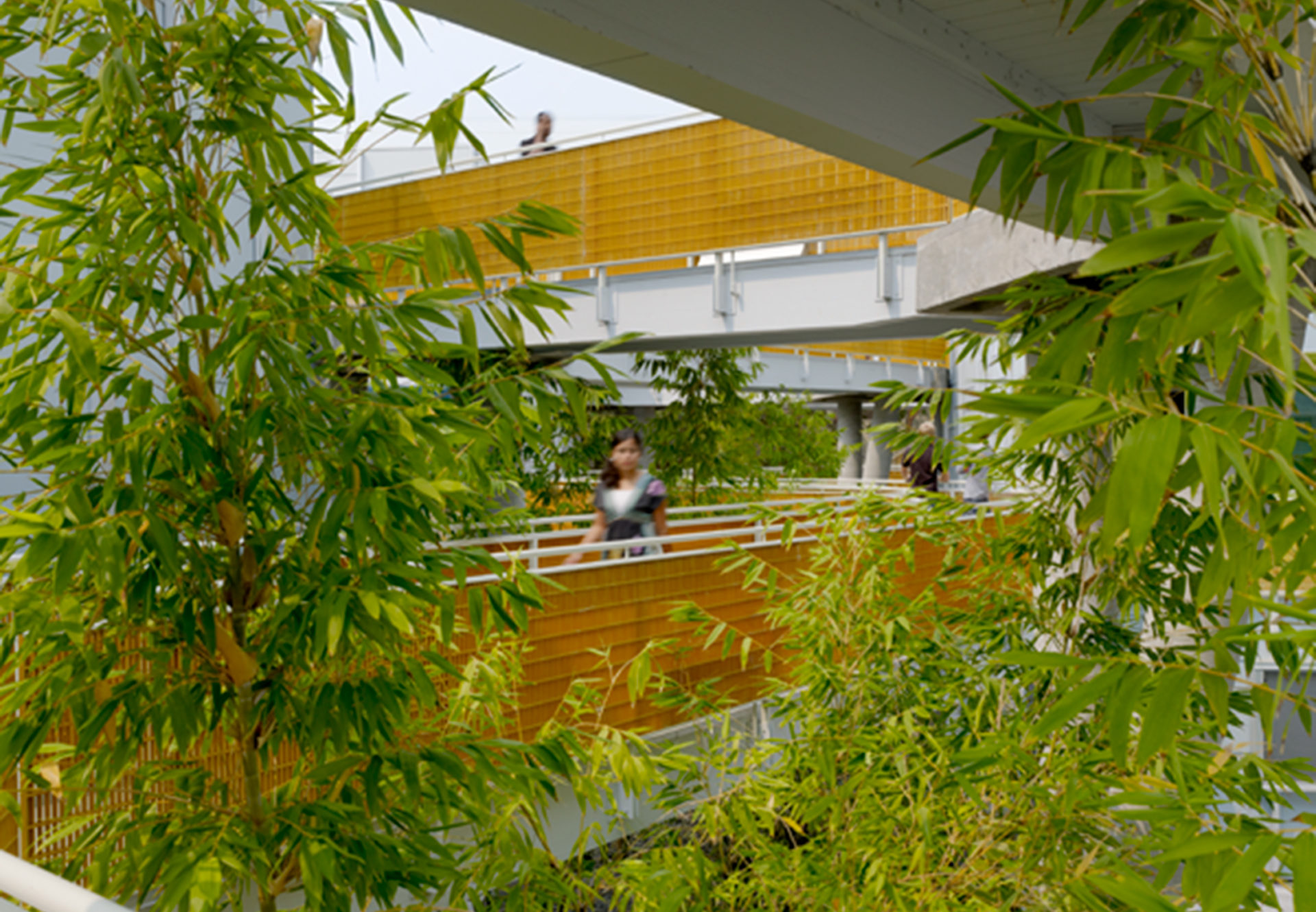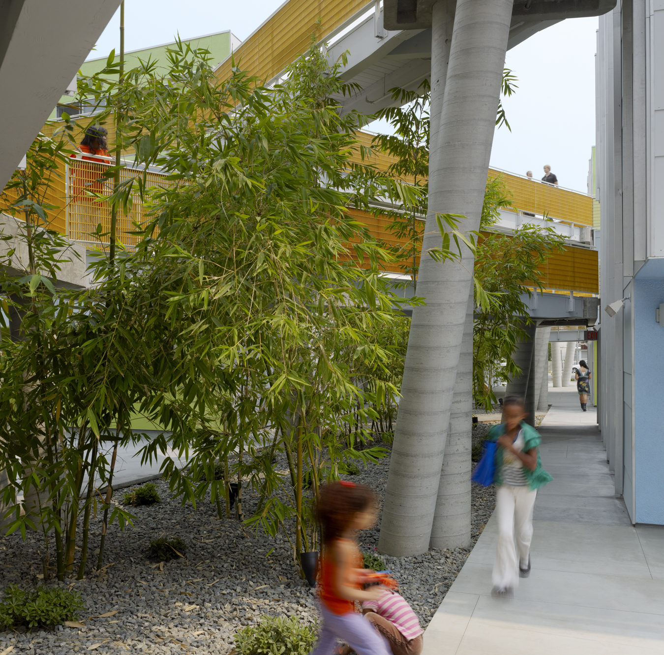Designed to exceed LEED standards, the site is organized so that all storm water is directed to a central water retention and recharge basin. Over this reservoir lies a timber bamboo forest crisscrossed by bridges at two levels. The cool microclimate established by this bamboo grove improves natural ventilation in the units and enhances the ecology and natural environment by reclaiming site area that was formerly asphalt paving. Designed to facilitate extremely low energy use, each unit has access to daylight on three sides, allowing natural light to fill the units throughout the day.