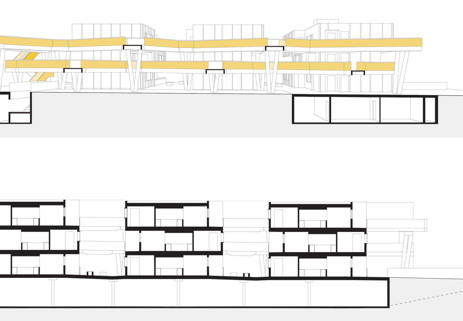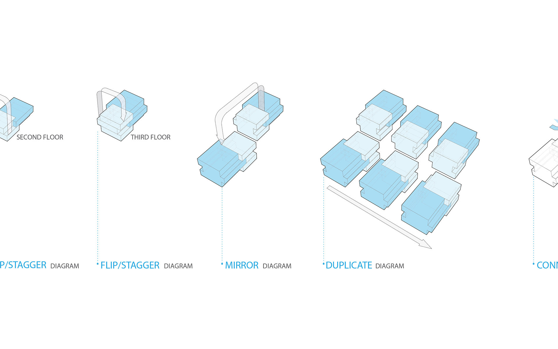 characterized by surface parking facing the street, exterior circulation, and a single, thematic ornament. The second is a broader notion of workforce housing, informed by the siedlung tradition of post-war European housing, guided by geometric regularity, access to natural light and ventilation, and privacy at the level of the individual unit.
