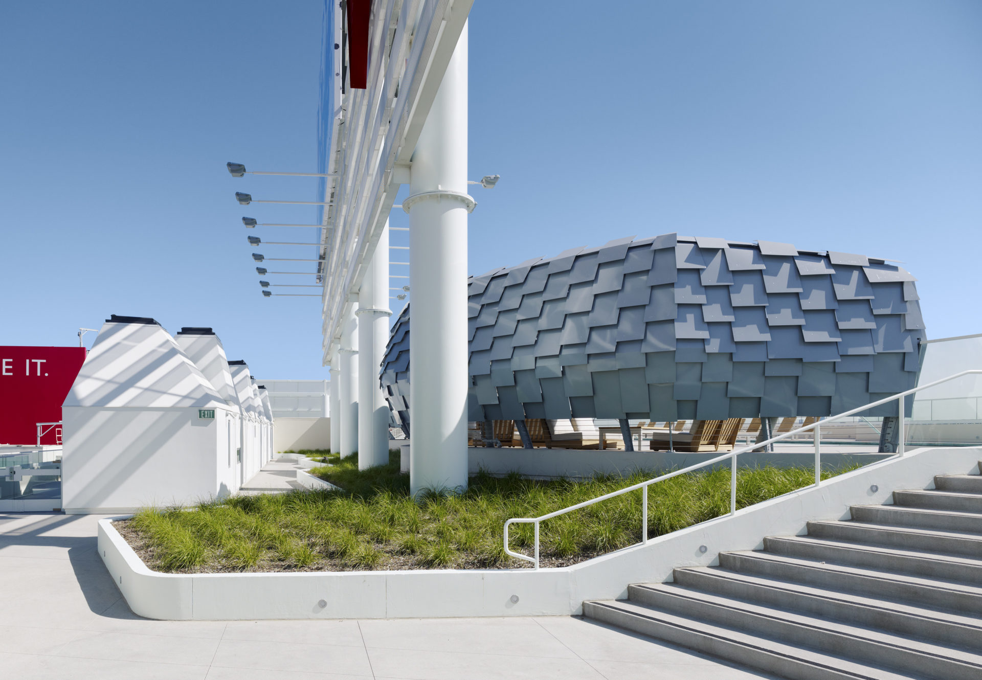 The custom-designed canopy that winds along the pool is a prefabricated sunshade supported by the heavy metal staples that make up the primary structure of the building, naturally designed to protect poolside guests from sun and dampen the wind. Other rooftop elements include pool, exercise room, event bar and small private cabanas.
